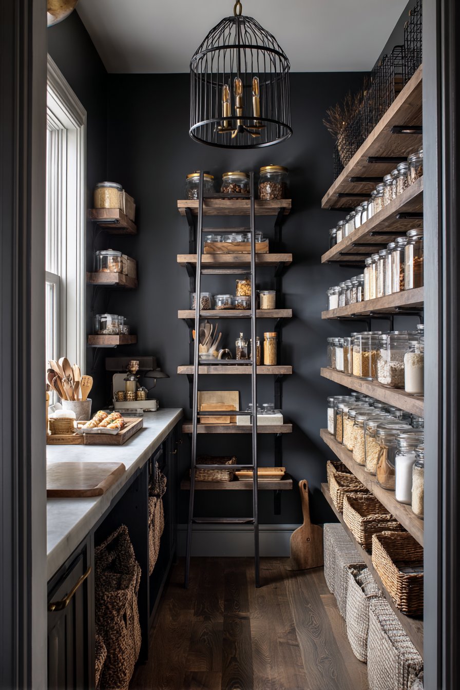 Open shelving displays ceramic canisters with pride. Glass jars with brass lids add metallic accents throughout. Woven storage bins introduce natural texture against the grey backdrop. A slim rolling ladder provides access to upper shelves. The industrial aesthetic combines function with distinctive style.