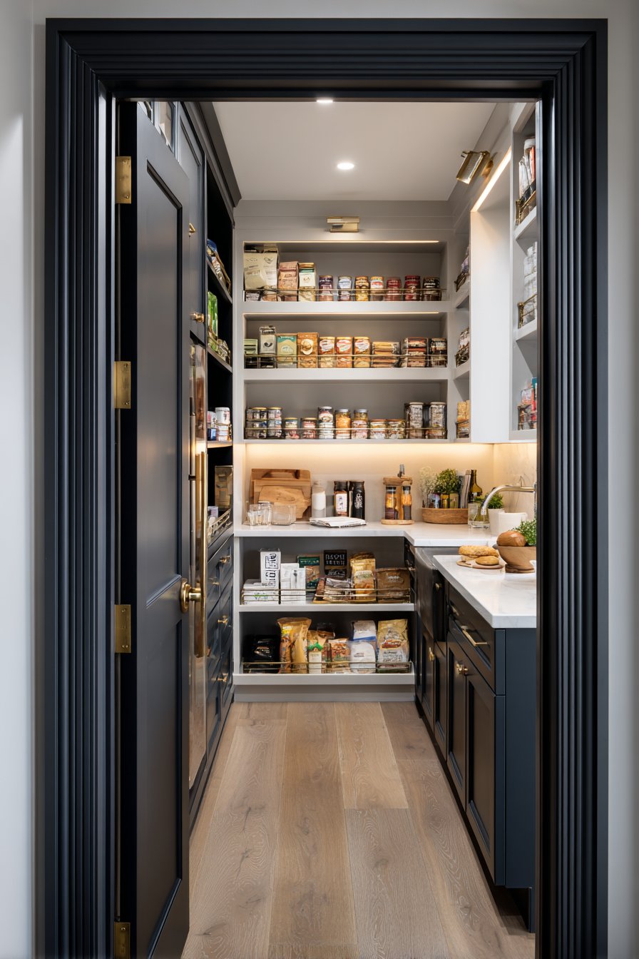 Tiered shelf organizers maximize vertical space for canned goods. Dedicated zones separate baking supplies from everyday items. Brushed gold hardware adds elegant detail throughout the space. The metallic accents catch light beautifully. Under-shelf lighting creates warm glow on quartz countertop workspace.