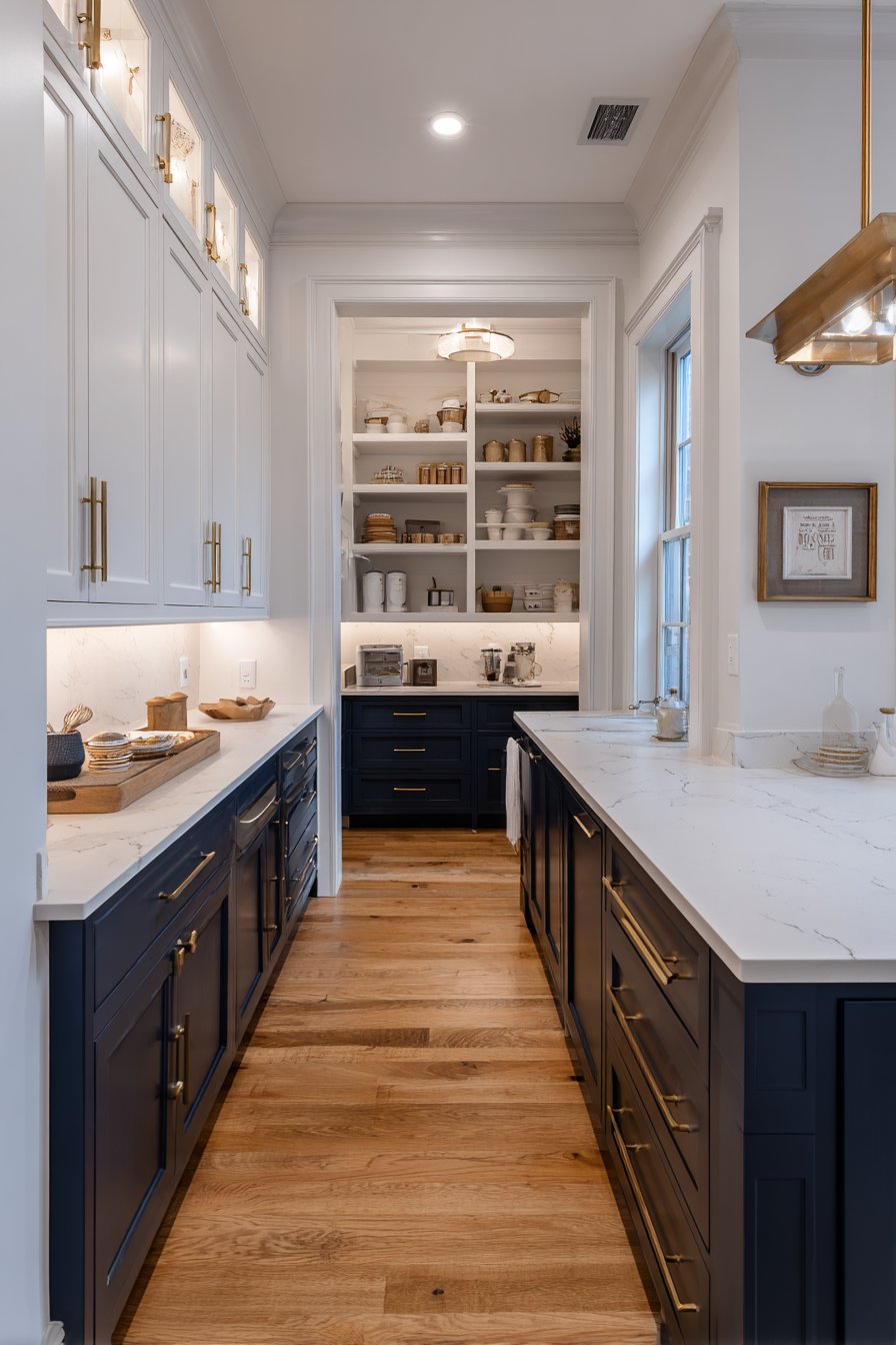 Wide-angle photography shows the complete organizational system. Balanced exposure highlights clever storage solutions in compact space. The two-tone approach adds sophistication without complexity. Color blocking defines different functional zones clearly. This design proves narrow pantries can feel luxurious.