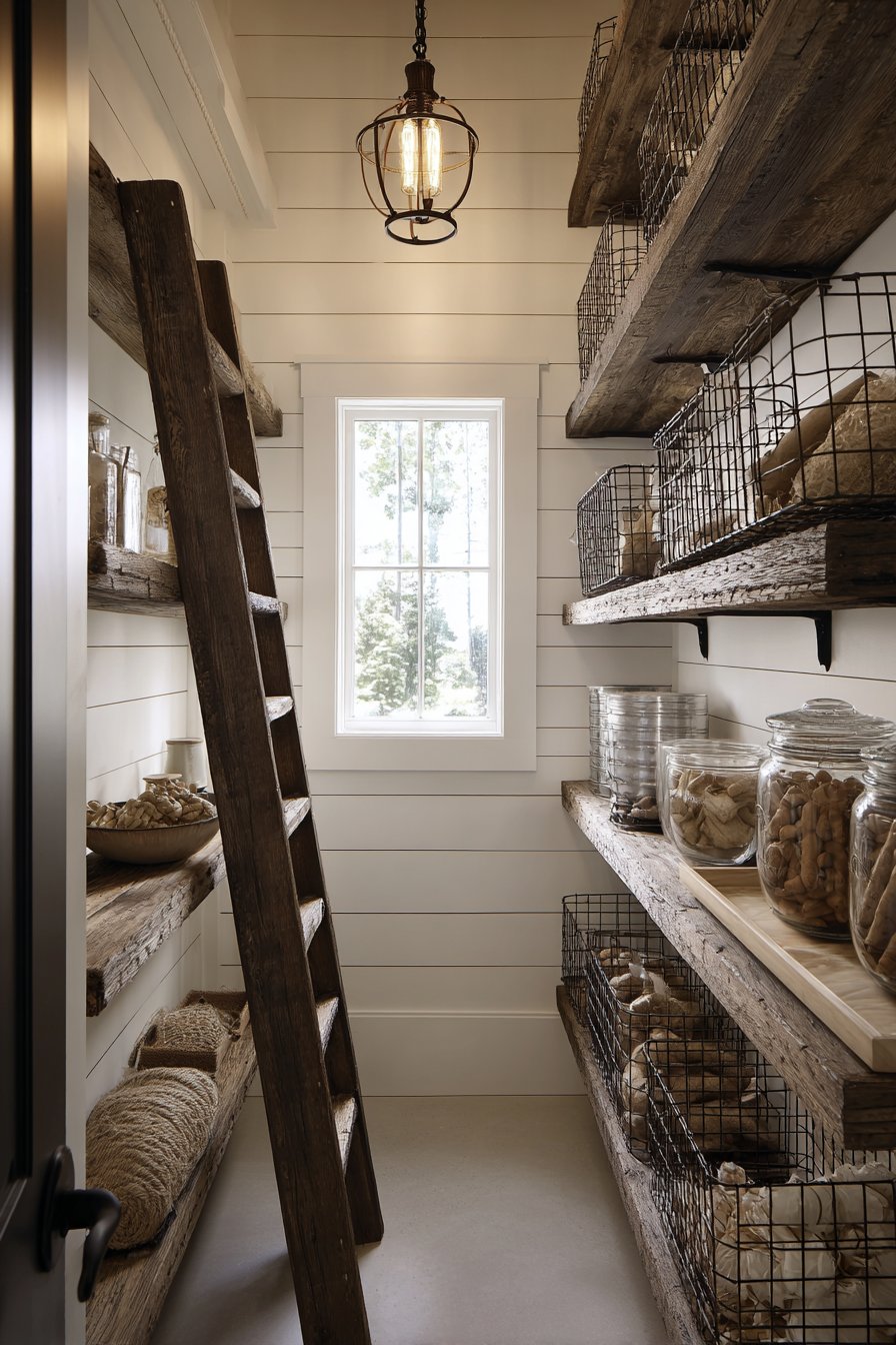 Reclaimed barn wood shelving contrasts beautifully against white shiplap walls. The tight thirty-four-inch space utilizes every available inch. Wire baskets store root vegetables with proper ventilation. Vintage mason jars hold bulk storage items attractively. Galvanized metal bins organize snacks with rustic charm.