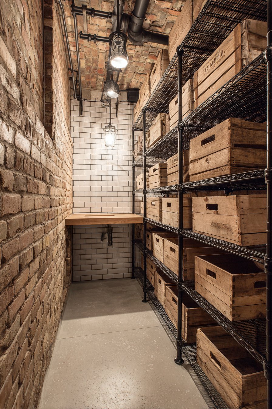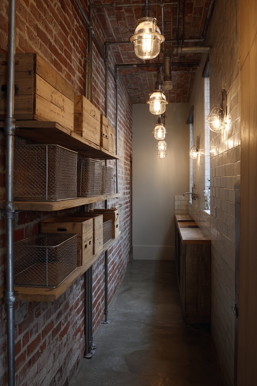 Exposed brick on one wall adds authentic industrial character. Metal pipe shelving system occupies the opposite side. The thirty-eight-inch space celebrates raw materials honestly. Vintage wooden crates provide storage with historical appeal. Metal mesh baskets add functional industrial aesthetic throughout.