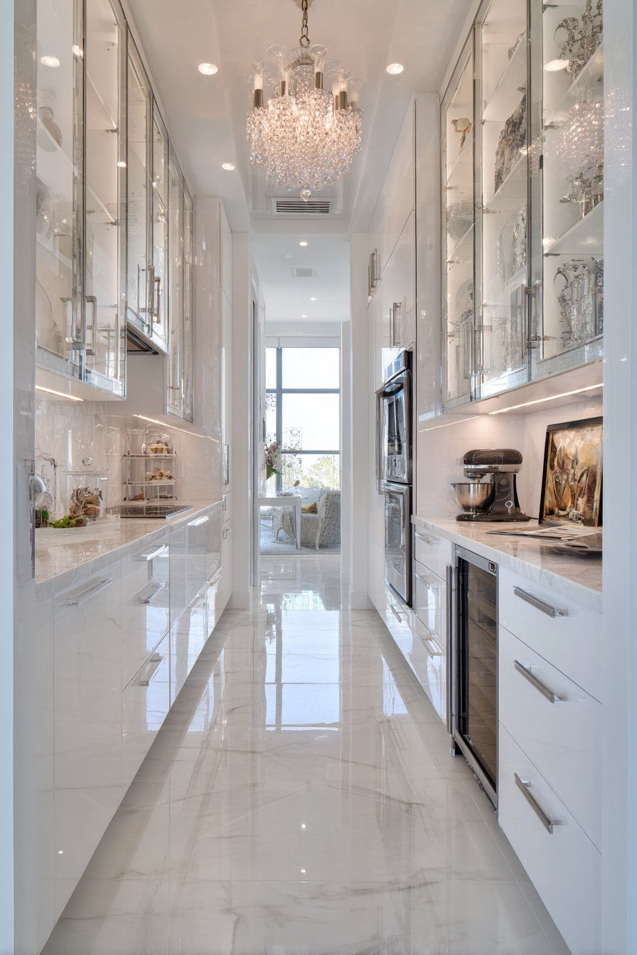 High-gloss white lacquer cabinets reflect light brilliantly. Soft-close mechanisms ensure quiet, smooth operation throughout. Integrated LED lighting within glass-front upper cabinets illuminates contents. The thirty-six-inch corridor feels luxurious despite modest width. A built-in wine rack stores bottles horizontally with proper care.