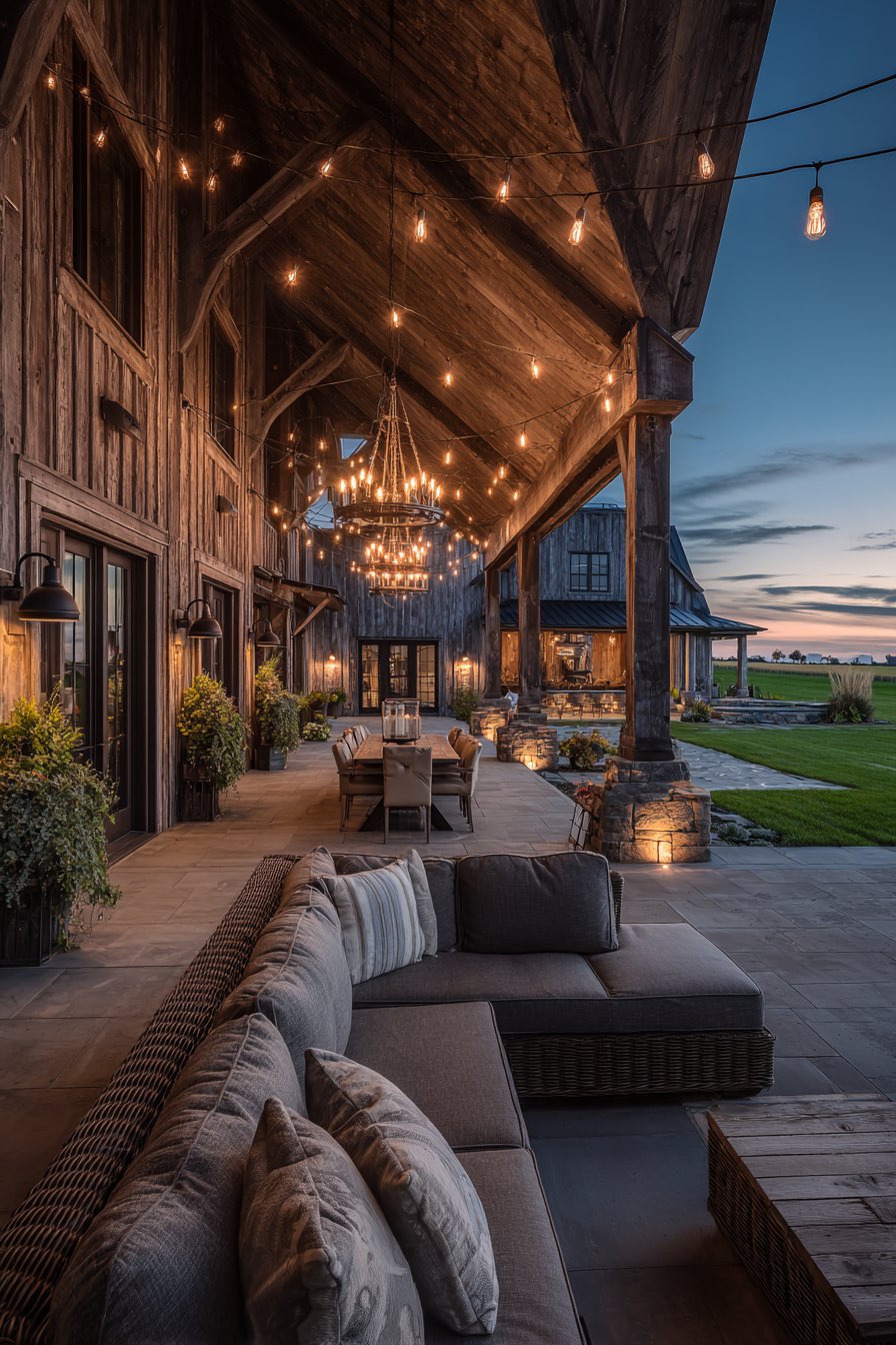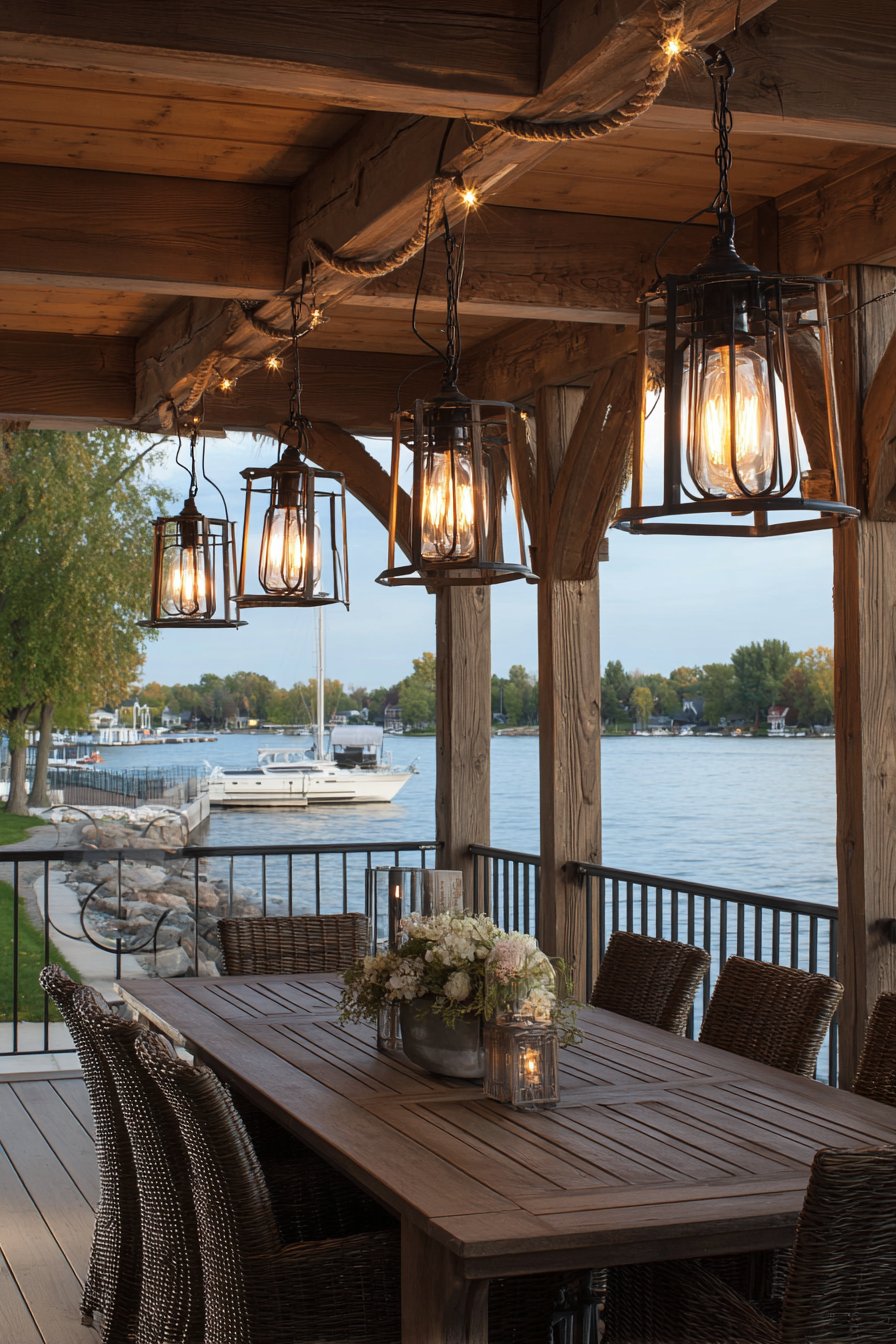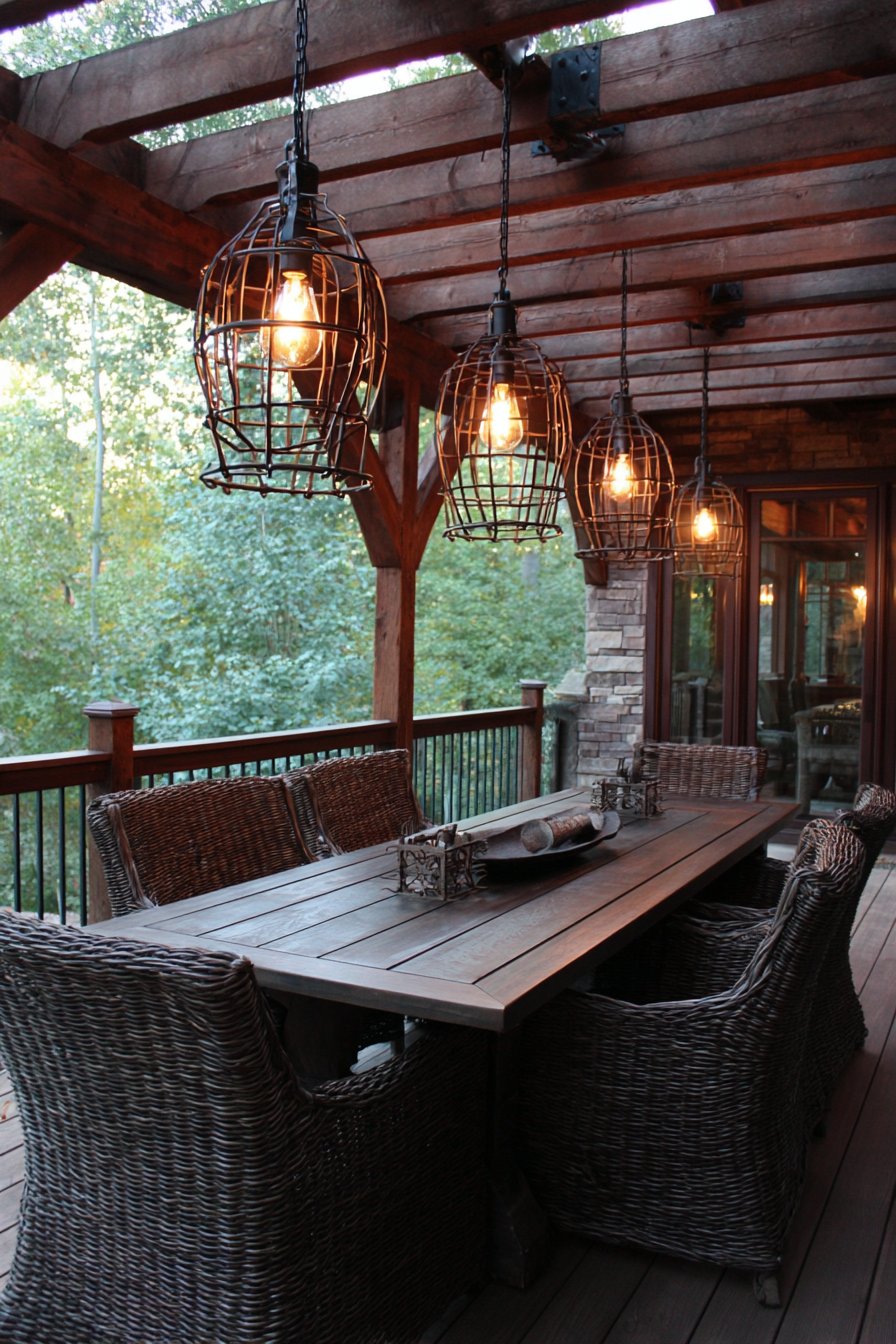 4. Rustic Covered Deck with Industrial Pendant Lighting