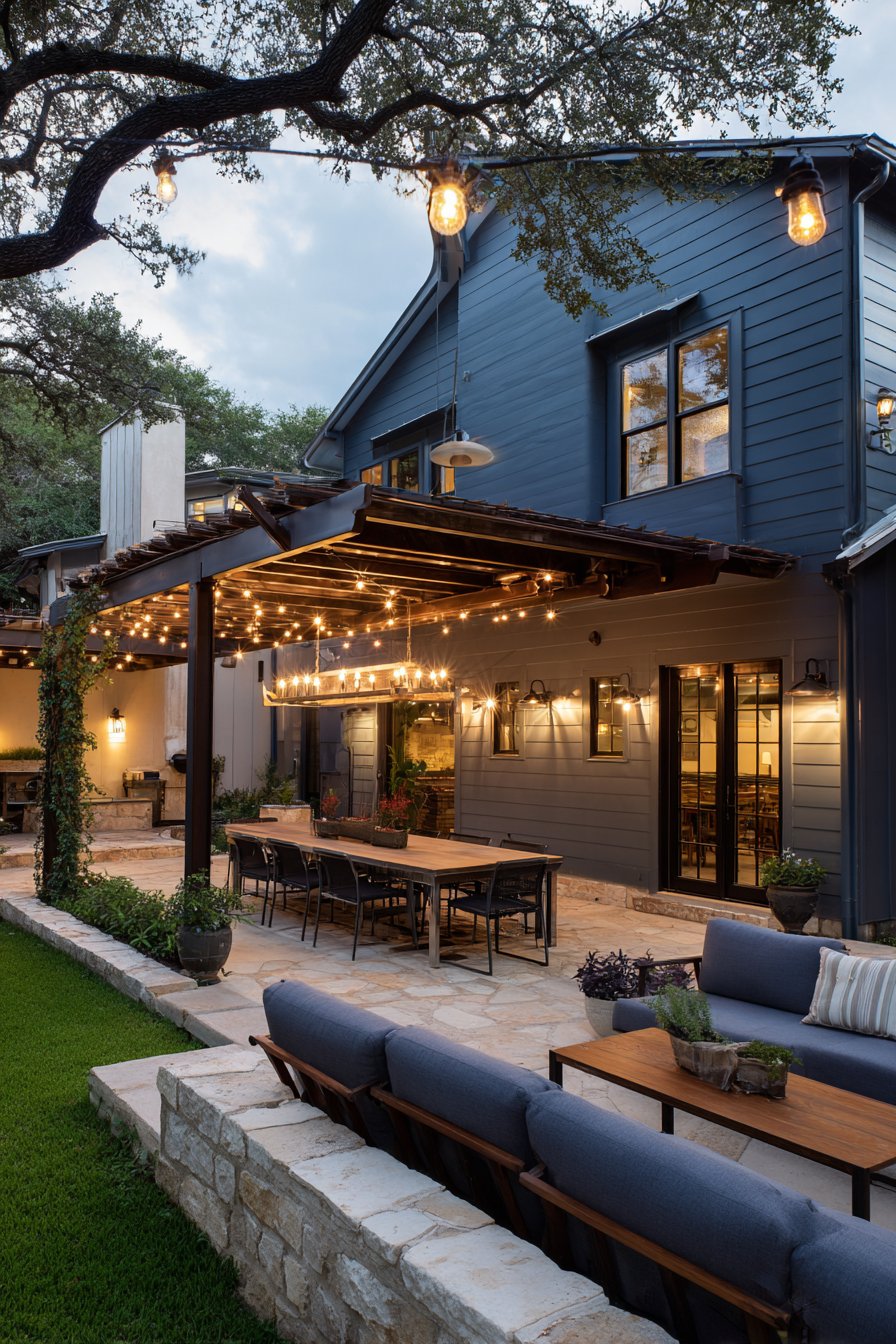 Climbing vines on the pergola structure interact with overhead lighting. This creates dappled light patterns throughout the space. Evening photography captures the celebratory ambiance perfect for outdoor entertaining. The layered decorative lighting transforms the simple structure into a magical gathering space.