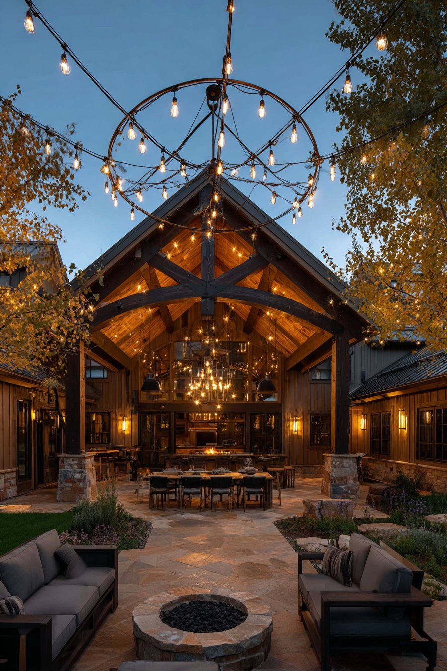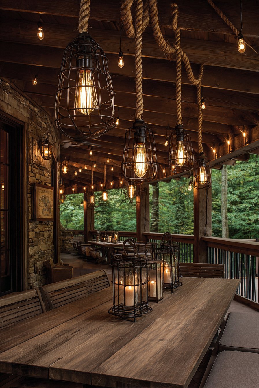 Varying pendant heights adds visual interest and accommodates different table heights. Aged metal cages develop authentic patina over time. Vintage filament bulbs produce warm light that enhances wood tones. The combination creates a rustic atmosphere perfect for outdoor entertaining.