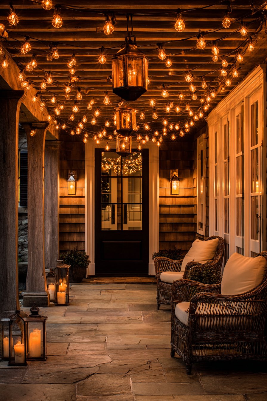 A welcoming front porch demonstrates how multiple lighting layers create depth and warmth. Vintage-style Edison bulb string lights drape overhead, forming a canopy of amber glow. Bronze wall sconces with frosted glass shades flank the entry door. A weathered copper lantern hangs from the ceiling beam, completing the trio.