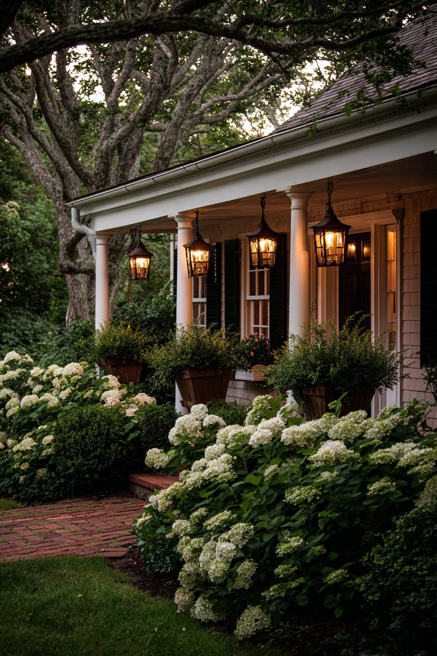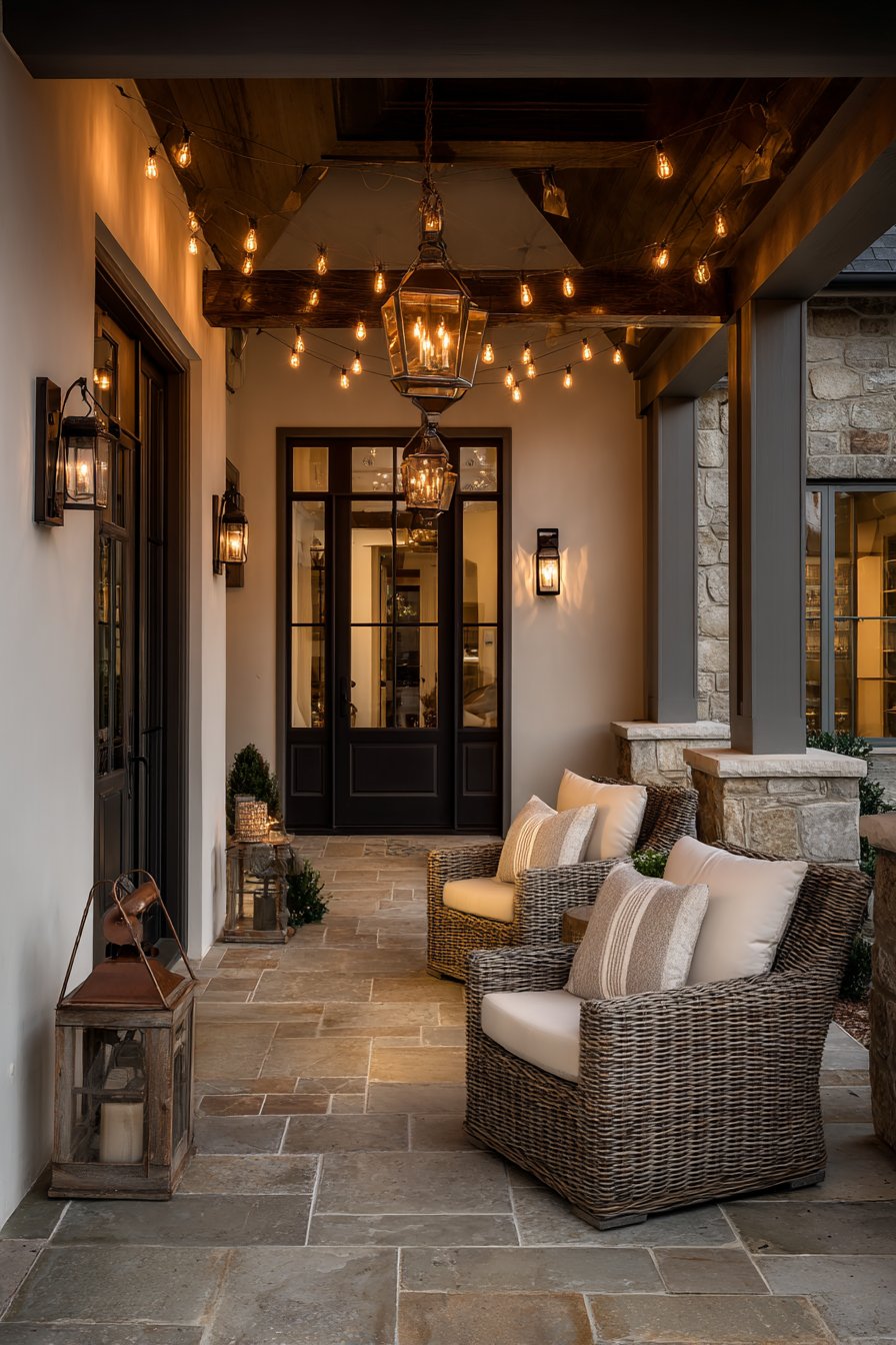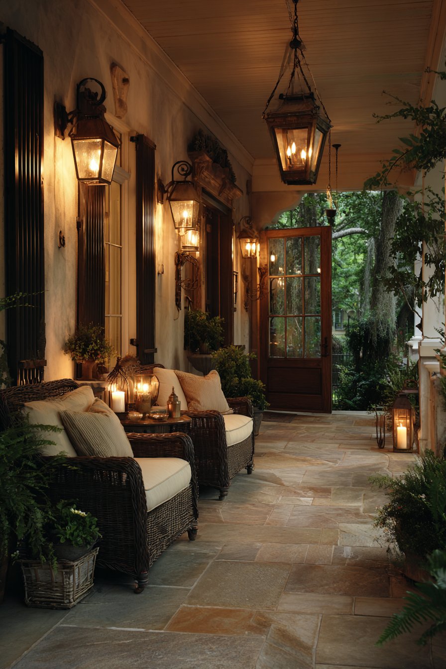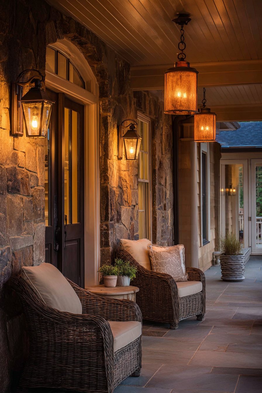1. Welcoming Front Porch with Layered Vintage Lighting
