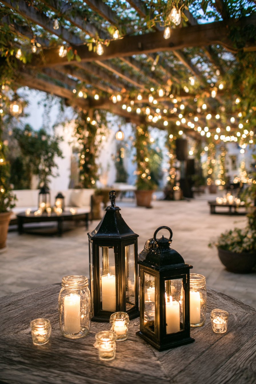 A festive pergola area showcases decorative outdoor lighting through layered string lights. Multiple strands of warm white bistro lights crisscross overhead in geometric patterns. Glass jar lanterns with tea lights are arranged as table centerpieces. Vintage-style filament bulbs in black wire cages hang at staggered heights around the seating perimeter.