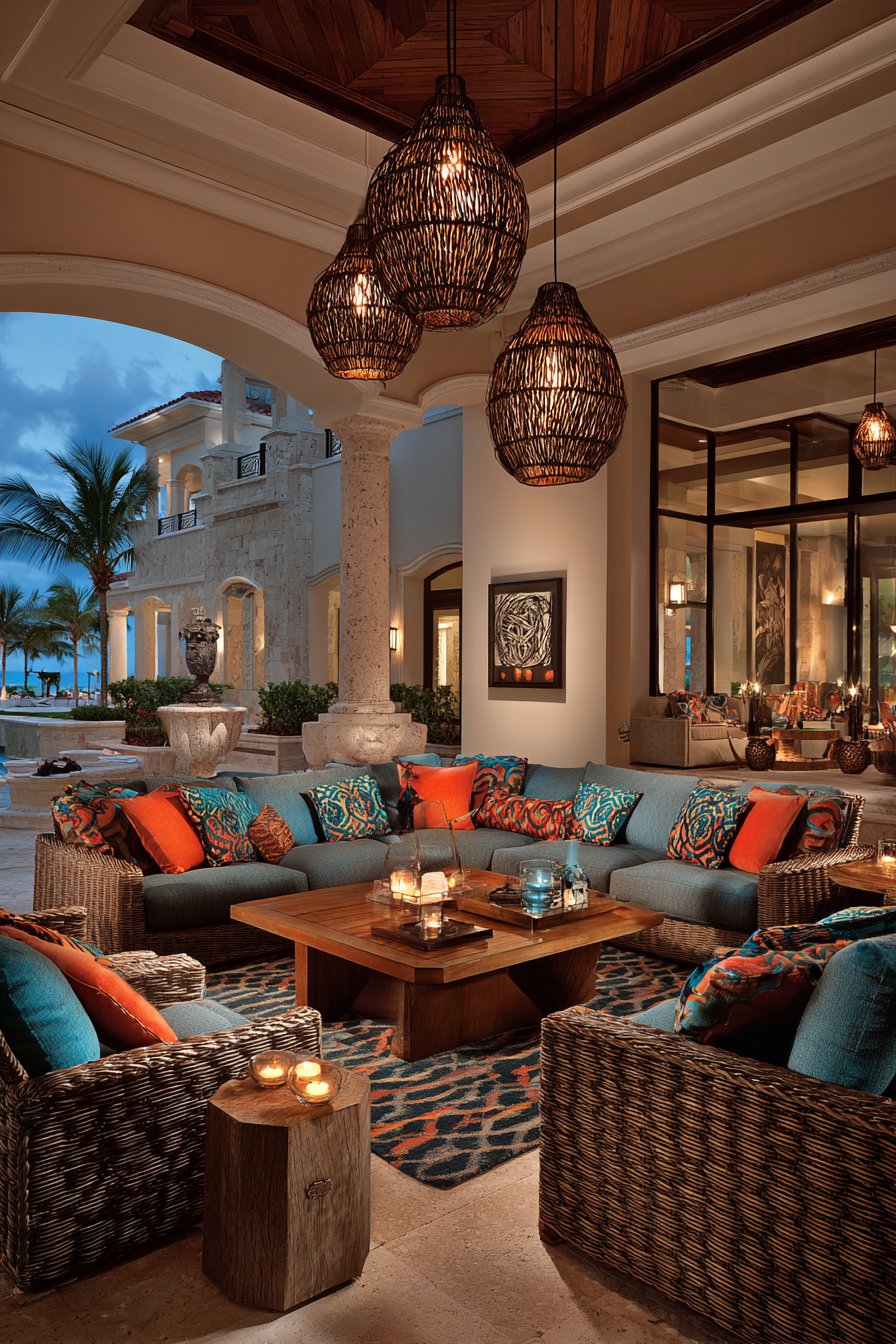 Natural stone flooring reflects the warm illumination during twilight hours. This creates a gentle shimmer that enhances the inviting atmosphere. Comfortable wicker chairs with cream cushions invite evening relaxation beneath the soft lighting. The combination of overhead, wall-mounted, and pendant fixtures provides comprehensive coverage.