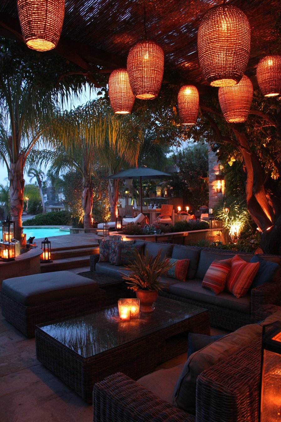 Natural rattan pendants bring organic texture to the overhead lighting. Varying heights create visual interest and define seating zones. Bamboo tiki torches provide ambient flicker around the perimeter. The movement adds living energy to static electric fixtures.
