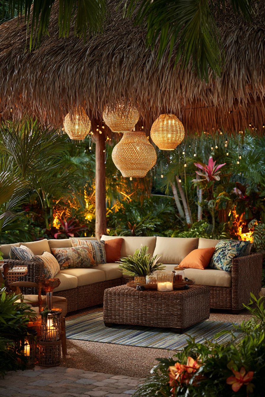 A tropical outdoor living room showcases exotic outdoor lighting through island-inspired fixtures. Woven rattan pendant lights in natural finish hang at varying heights above sectional seating. Tiki torches with bamboo posts place strategically around the space perimeter. LED strips in warm amber tones hide within palm frond arrangements for uplighting effects.