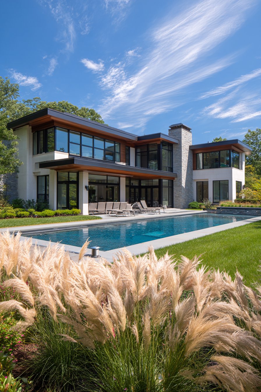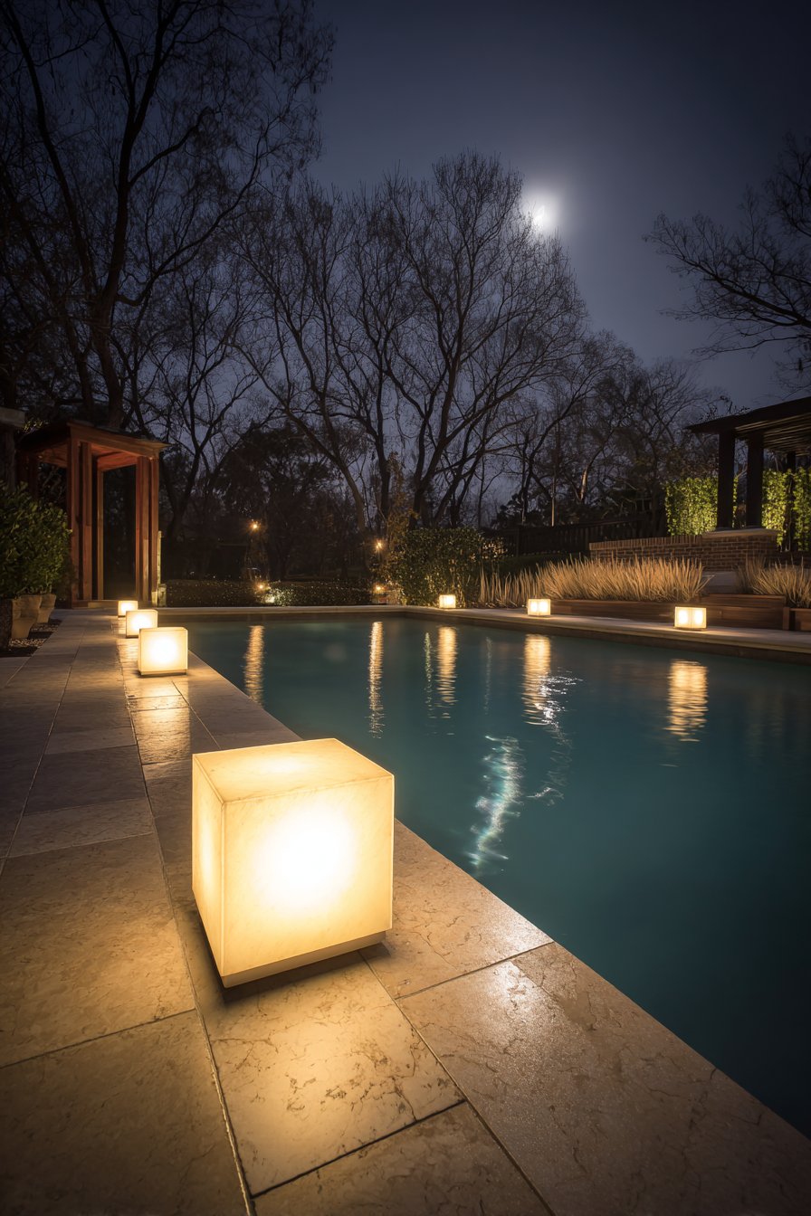 Stainless steel bollard lights withstand pool chemicals and moisture exposure. Their cube shape reinforces contemporary geometric design. Ornamental grass uplighting creates dramatic vertical shadows. The comprehensive technological approach demonstrates cutting-edge landscape lighting design.