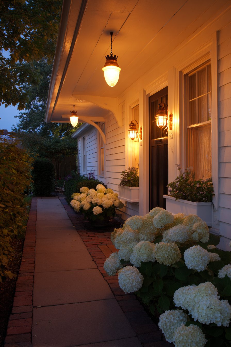 A cottage-style front yard demonstrates charming outdoor lighting through period-appropriate fixtures. Vintage milk glass pendant lights hang from a covered porch ceiling. Decorative post lights with copper finish and seeded glass panels mark the brick walkway beginning. Small accent lights tuck among hydrangea bushes, creating soft uplighting on white painted siding.