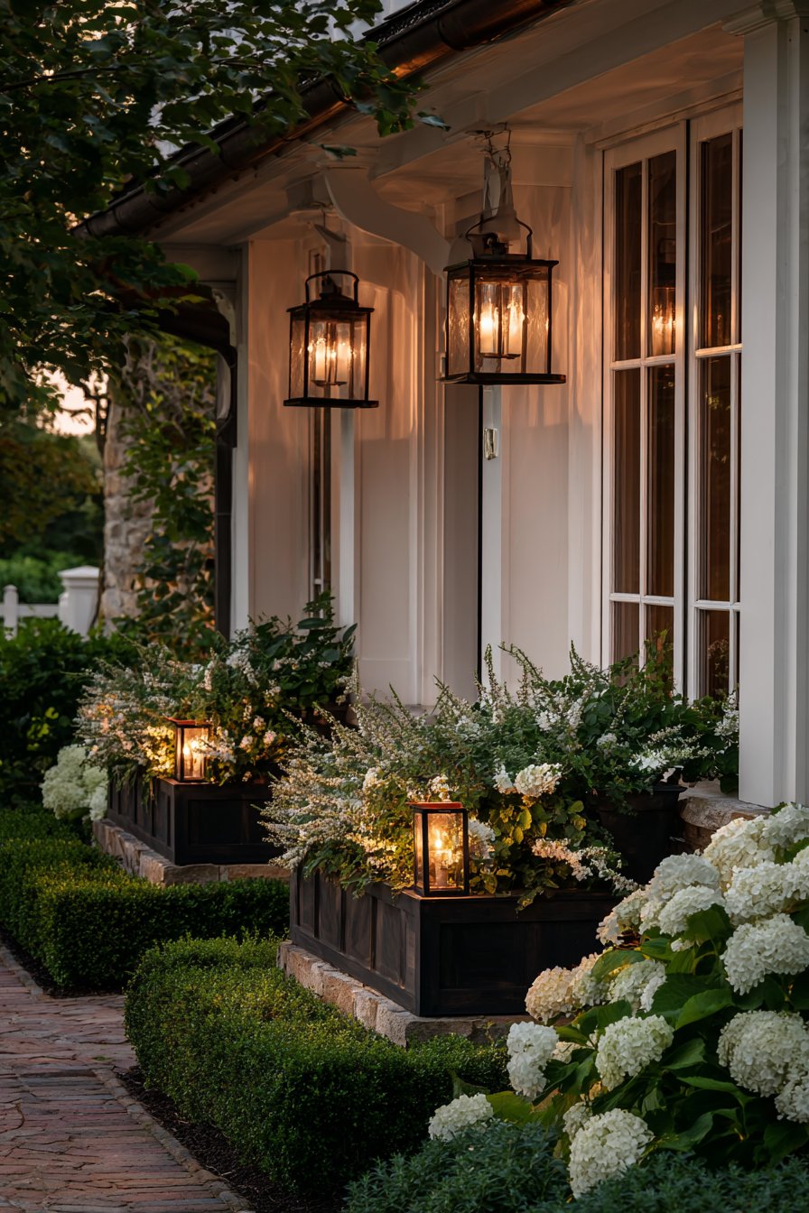 Accent lights hidden among hydrangeas create gentle uplighting effects. The subtle illumination highlights architectural details without harsh glare. Window box lighting adds finishing touches to the charming composition. The cohesive approach respects the cottage’s traditional character.