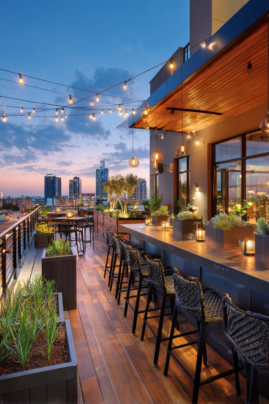 Globe pendants on adjustable cables offer flexible positioning over counters. Large Edison bulbs on cable railings create dramatic overhead lighting. The industrial elements coordinate with urban skyline views. The comprehensive design makes rooftop spaces functional after dark.