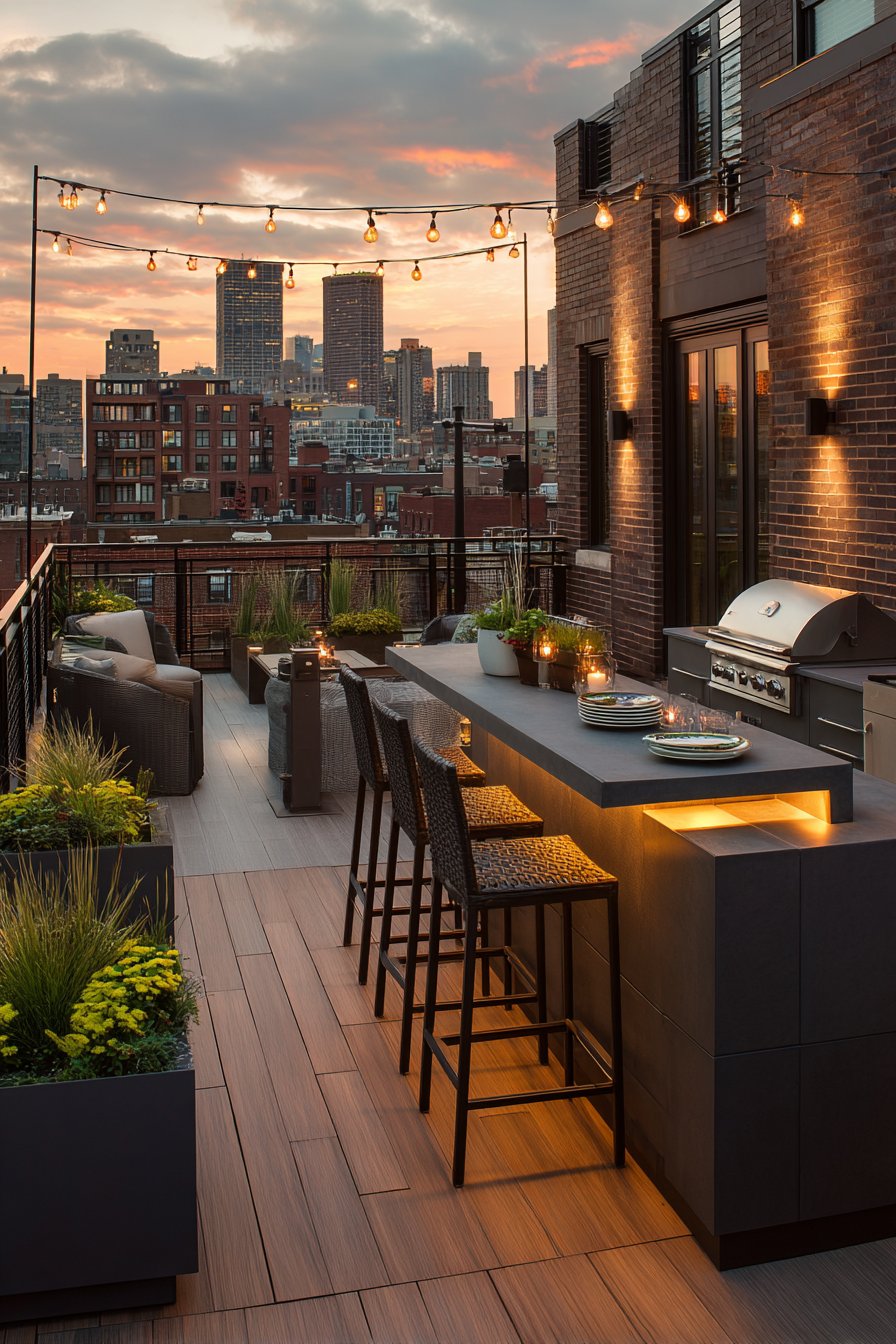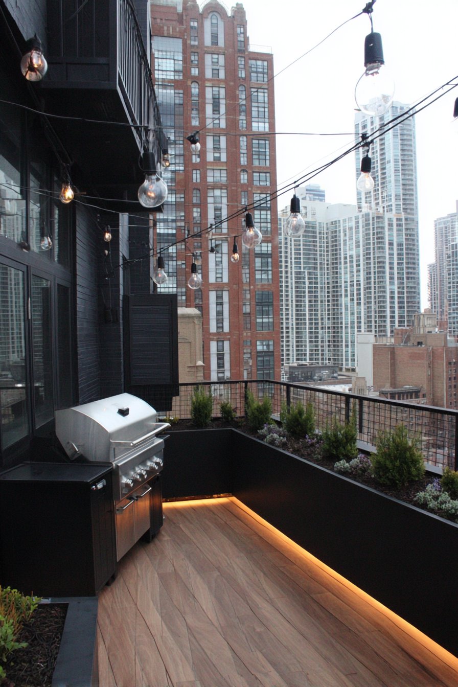 Matte black wall sconces deliver essential task lighting for cooking areas. The industrial style complements urban rooftop settings. Concealed LED strips in planters provide modern ambient illumination. The hidden placement maintains clean contemporary aesthetics.