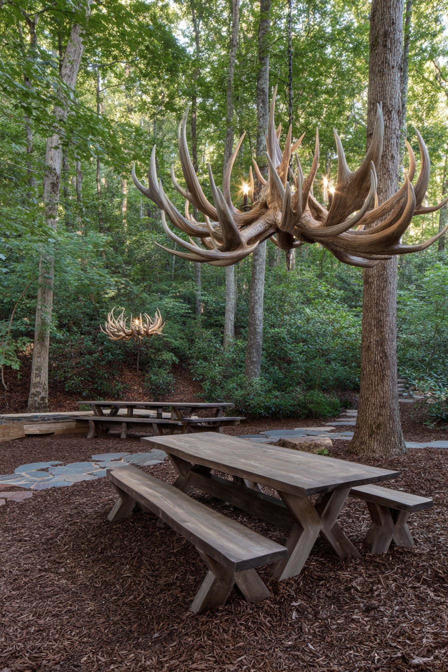 Antler replica chandeliers bring rustic elegance to covered gathering areas. Hidden bench lighting provides safety without compromising naturalistic aesthetics. The comprehensive concealment strategy preserves the woodland’s authentic character. Lighting enhances rather than dominates the natural environment.