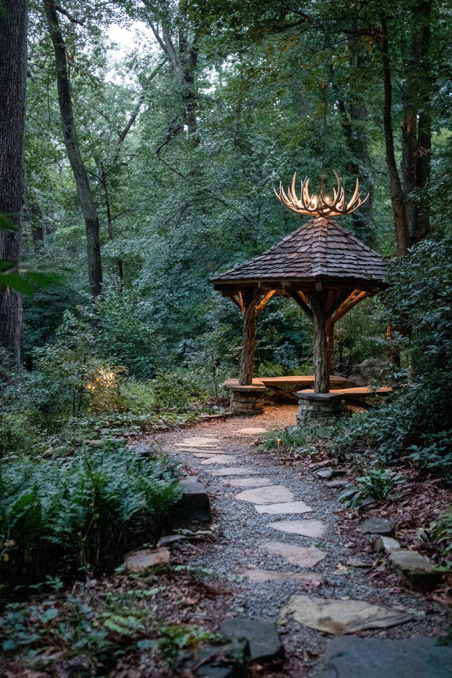 A woodland garden retreat features naturalistic outdoor lighting through concealed fixtures. Low-voltage well lights position at tree bases, creating dramatic uplighting through the canopy. Path lights disguised as stones with subtle top illumination guide visitors along mulch trails. A rustic chandelier made from antler replicas hangs in a covered pavilion area.