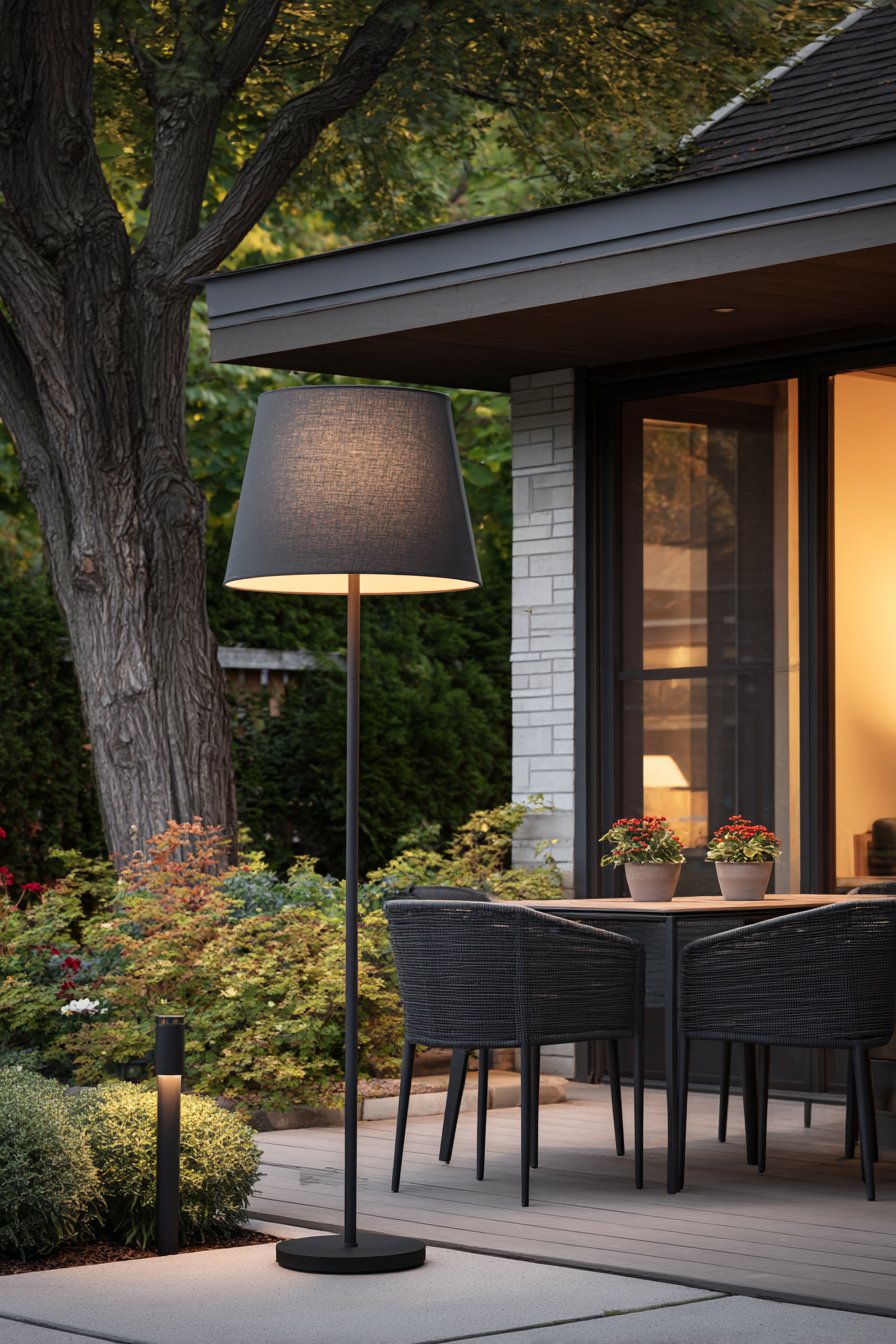 The sculptural floor lamp adds an artistic element to the functional design. Weather-resistant materials ensure durability in outdoor conditions. The fabric shade softens LED light for comfortable reading or conversation. This approach demonstrates that modern lighting can be both beautiful and practical.