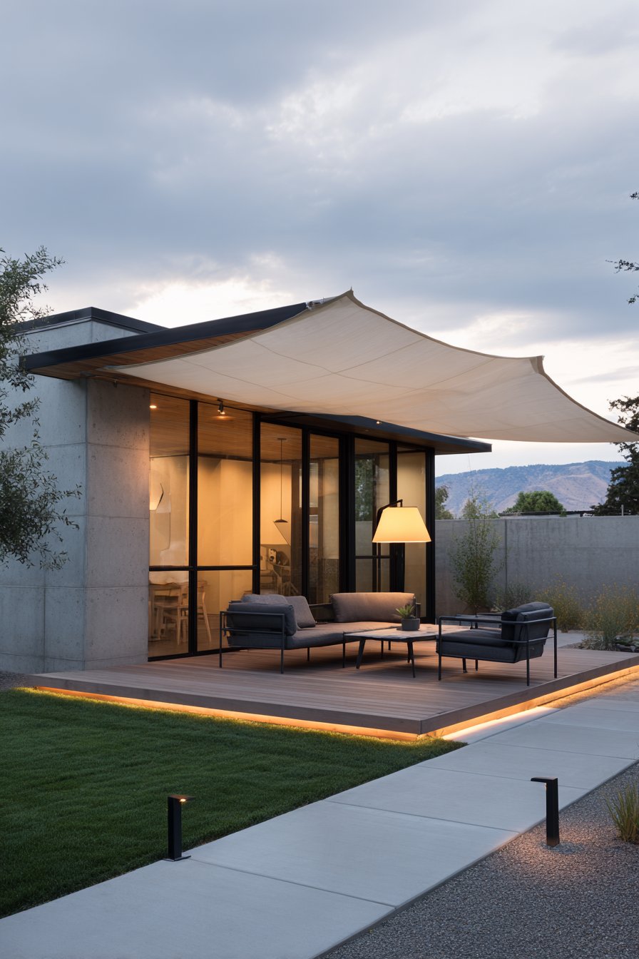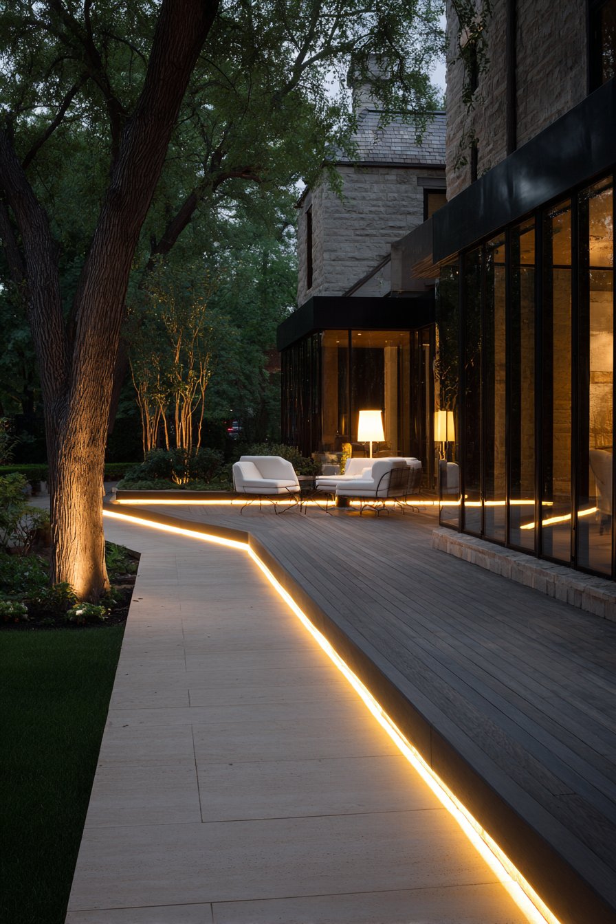 A modern backyard patio showcases how contemporary lighting defines outdoor living zones. Sleek LED strip lights recess into the composite deck edge. This creates a subtle perimeter glow that outlines the space. Minimalist black metal path lights line the walkway to the seating area.