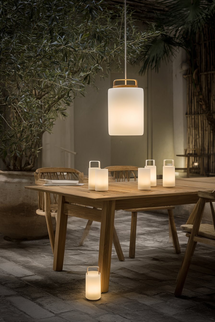 A Scandinavian-inspired outdoor dining area demonstrates minimalist outdoor lighting through restrained fixture selection. A single oversized pendant light in white powder-coated metal and natural oak accents hangs centrally above a simple teak table. Cylindrical wall sconces in matching finish flank a privacy screen. Small solar lights with frosted glass domes line a concrete paver path.