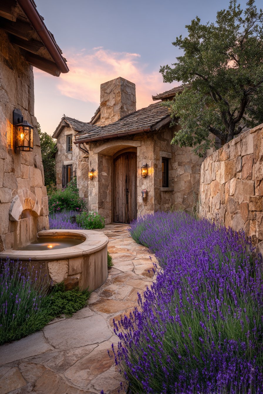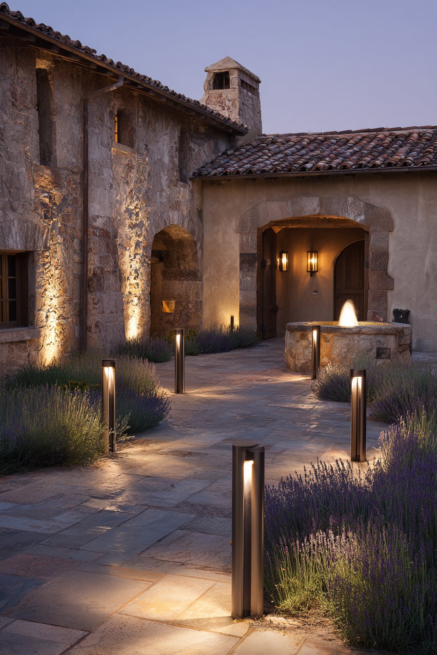 Uplighting among lavender creates dramatic shadows that change with plant movement. This adds dynamic visual interest throughout the evening. Submersible fountain lights transform water features into focal points. The combination of different fixture types creates a comprehensive lighting scheme.