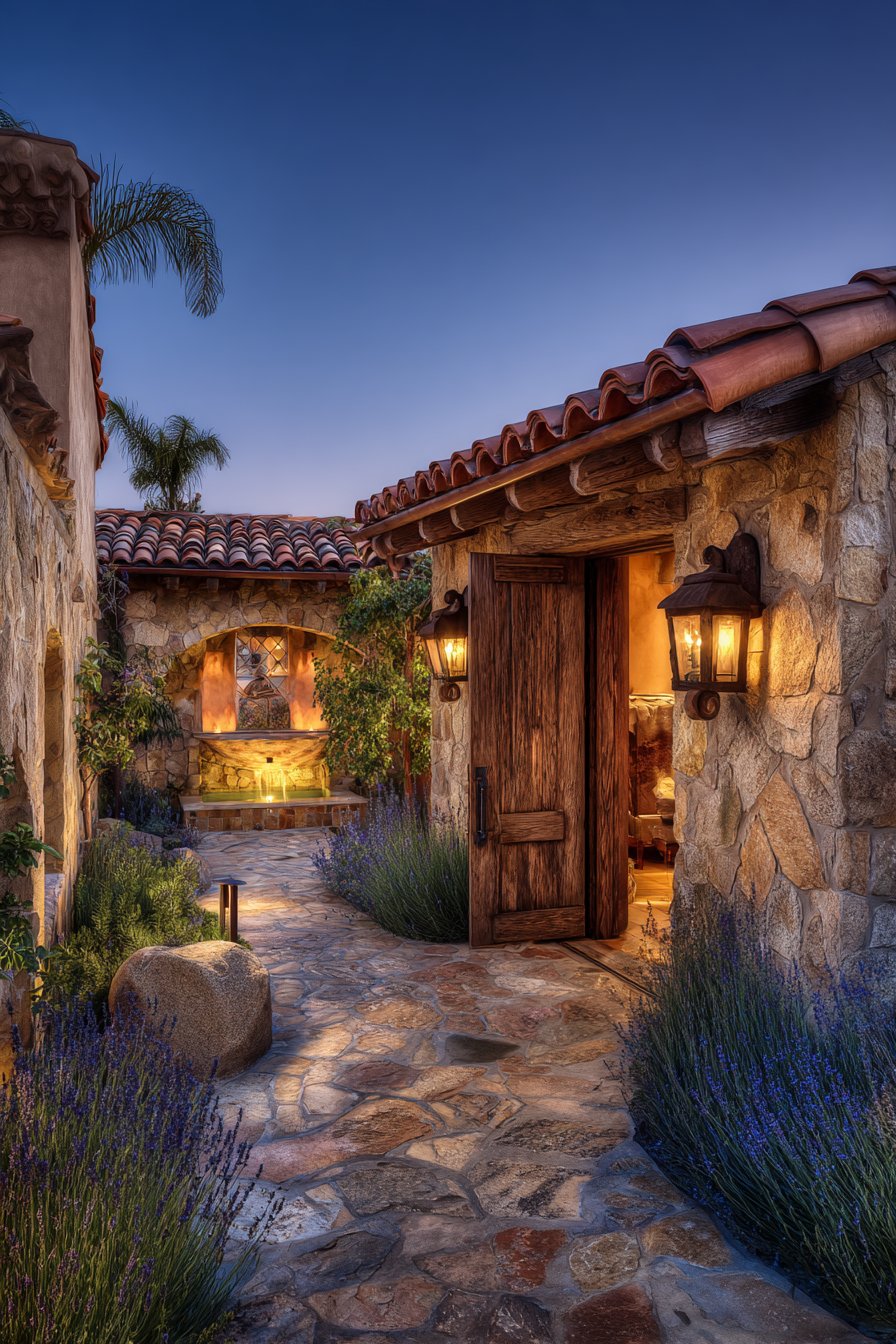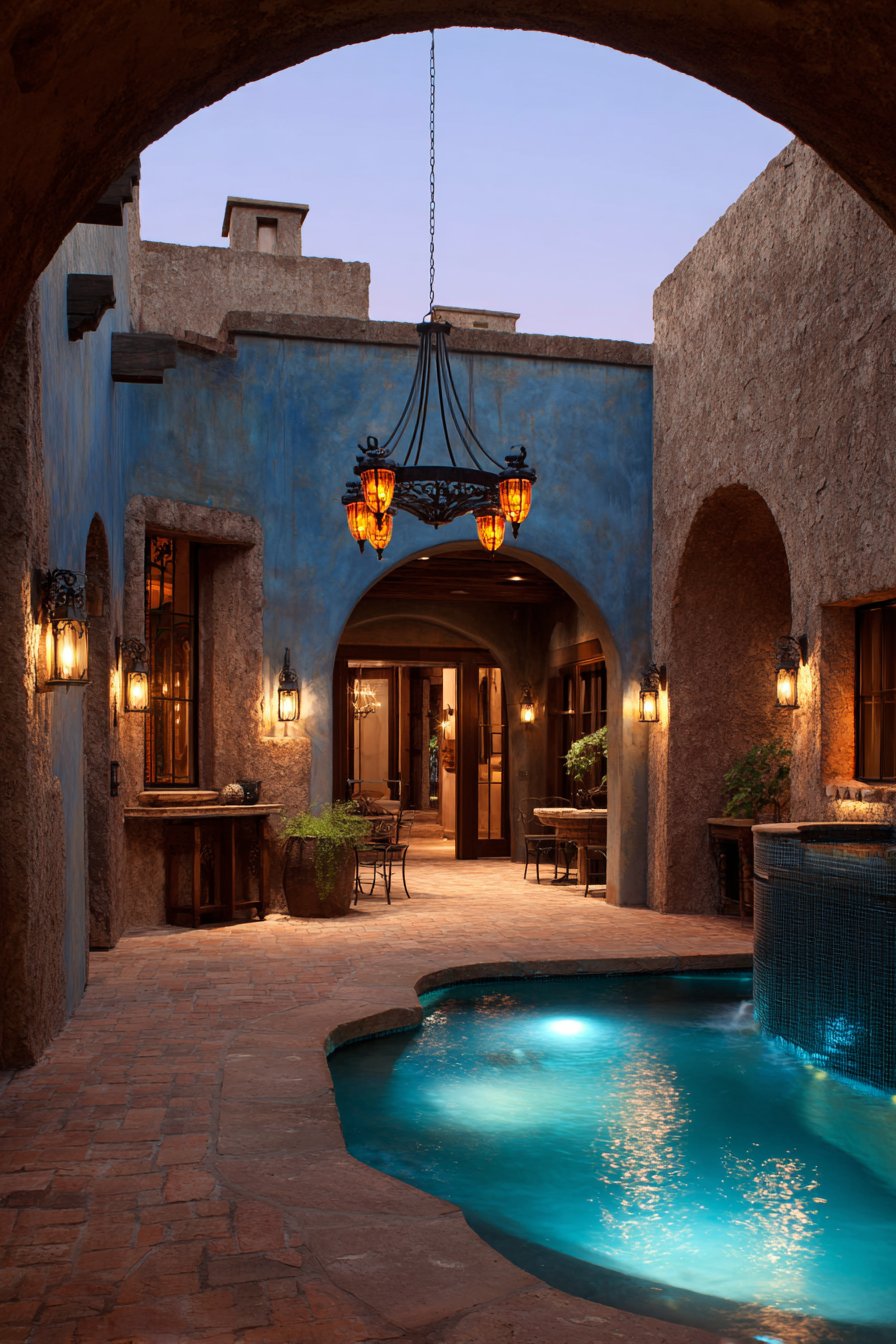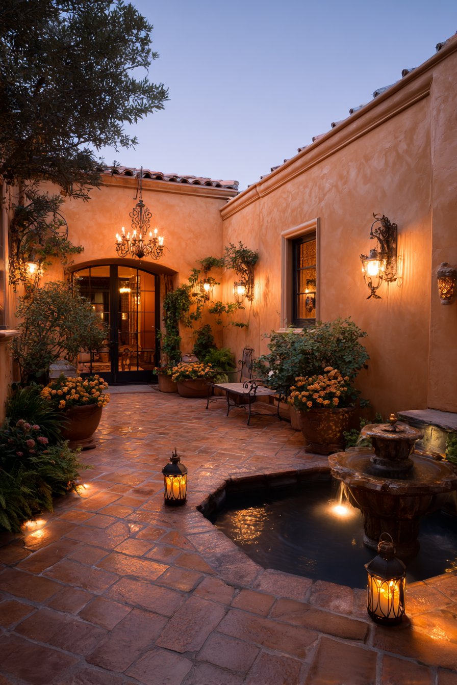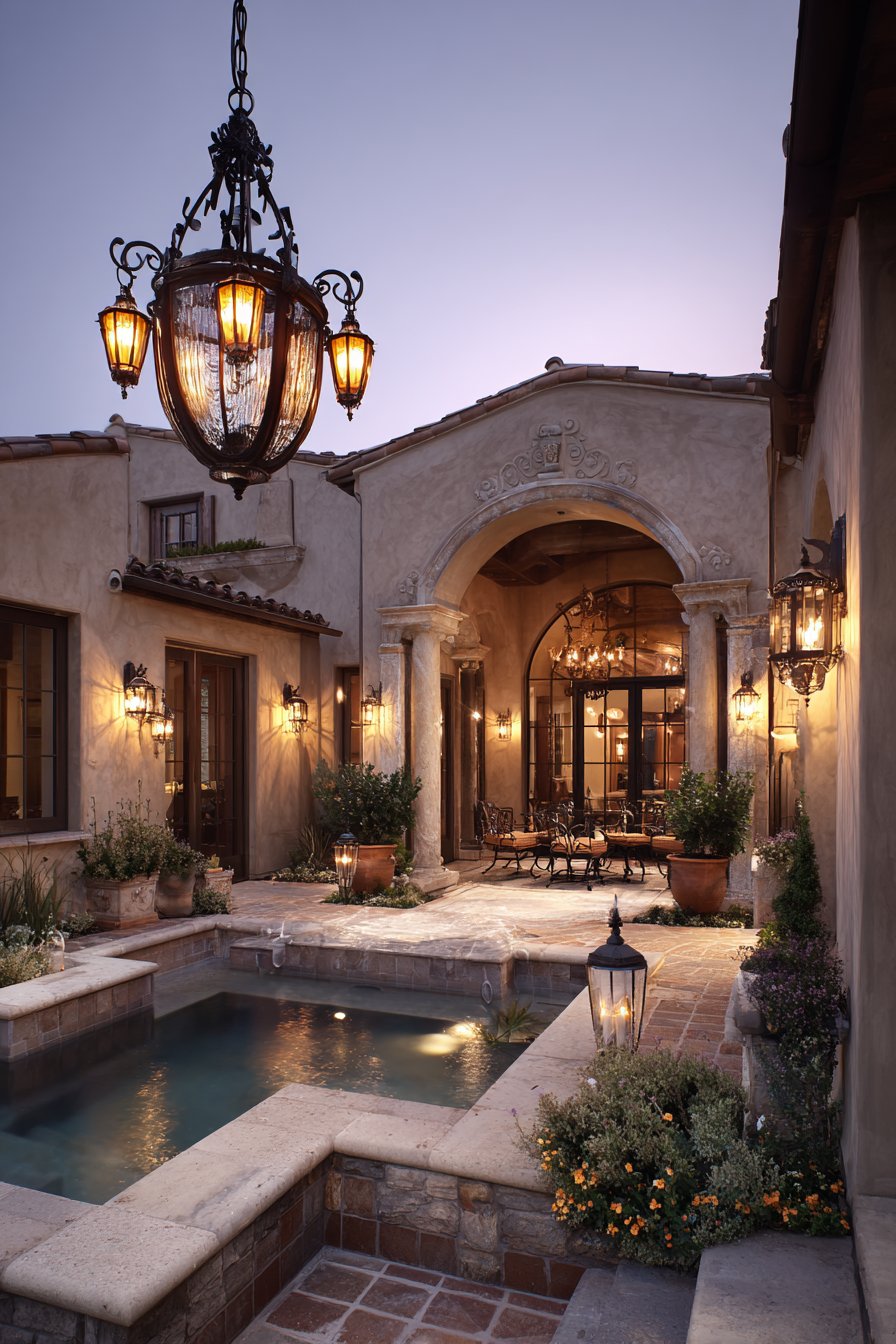 6. Mediterranean Courtyard with Elegant Statement Fixtures