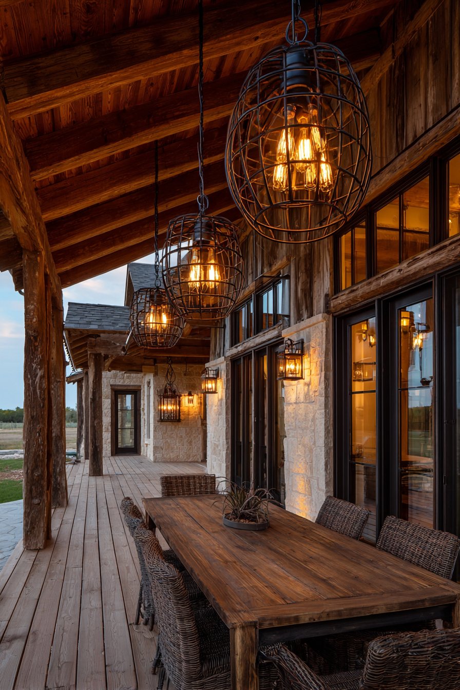 A spacious covered deck showcases rustic outdoor lighting through industrial-style fixtures. Three oversized pendant lights hang from exposed wood beams at varying heights. Each fixture features aged metal cages with vintage filament bulbs. The downward pools of light create intimate zones above a farmhouse dining table.