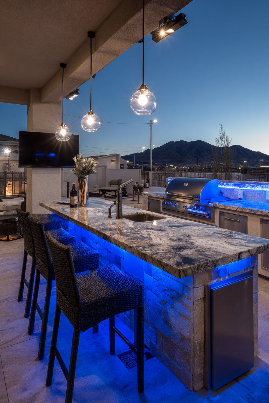 A contemporary outdoor kitchen features sophisticated lighting integrated throughout the workspace. Stainless steel under-cabinet LED strips illuminate the granite countertop work surface. Pendant lights with clear glass globes suspend over the bar seating area. Directional spotlights mount under the pergola, highlighting the cooking zone.