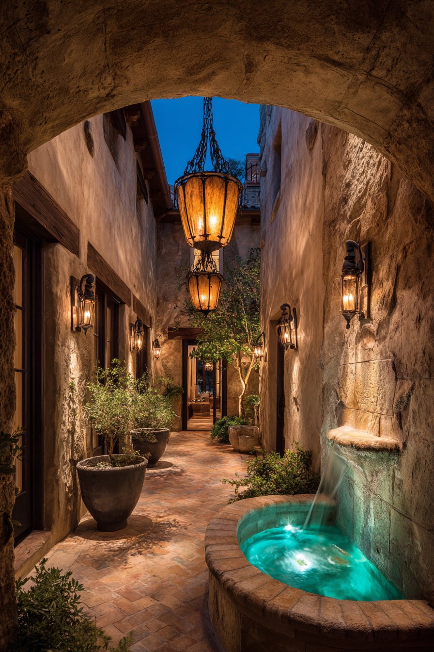 A central fountain features underwater LEDs that create gentle rippling light effects. Twilight photography captures the romantic lighting scheme’s transformative power. The courtyard becomes an enchanting evening retreat through strategic illumination. Wrought-iron fixtures complement the Mediterranean architectural style perfectly.