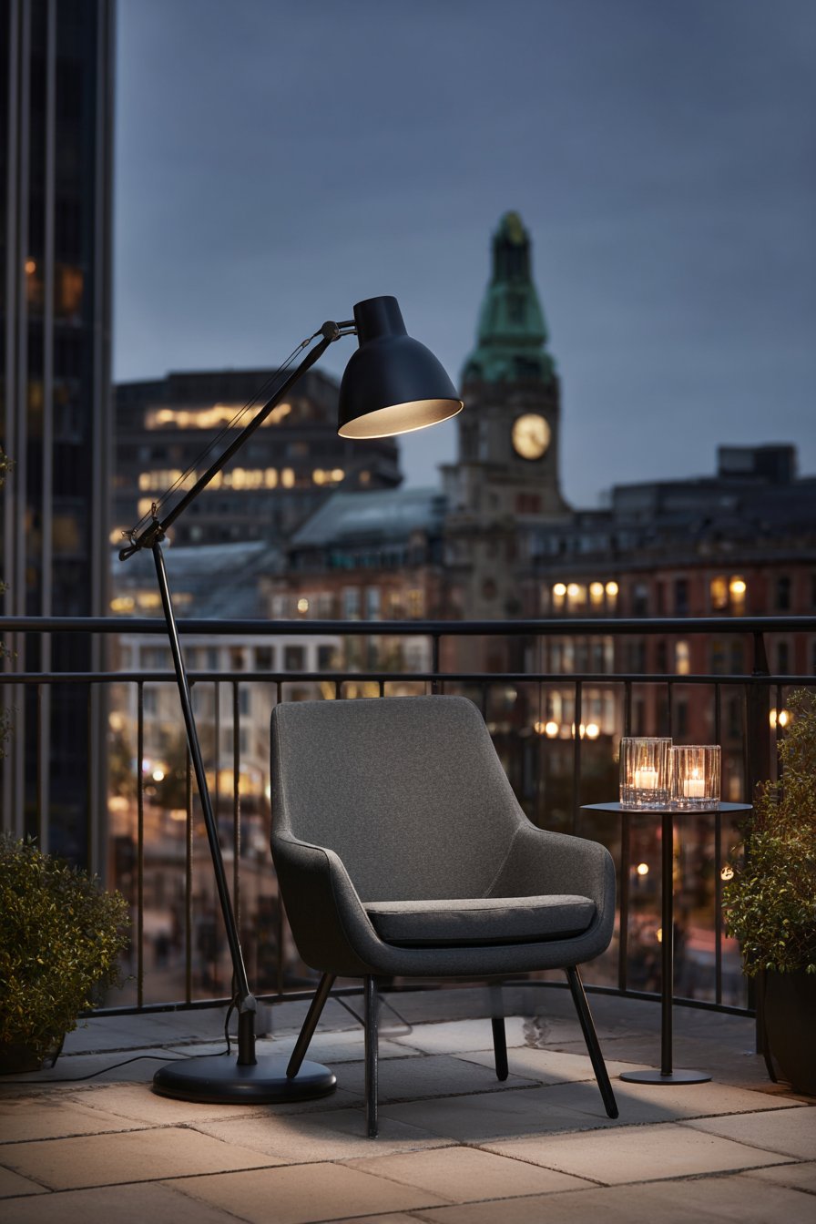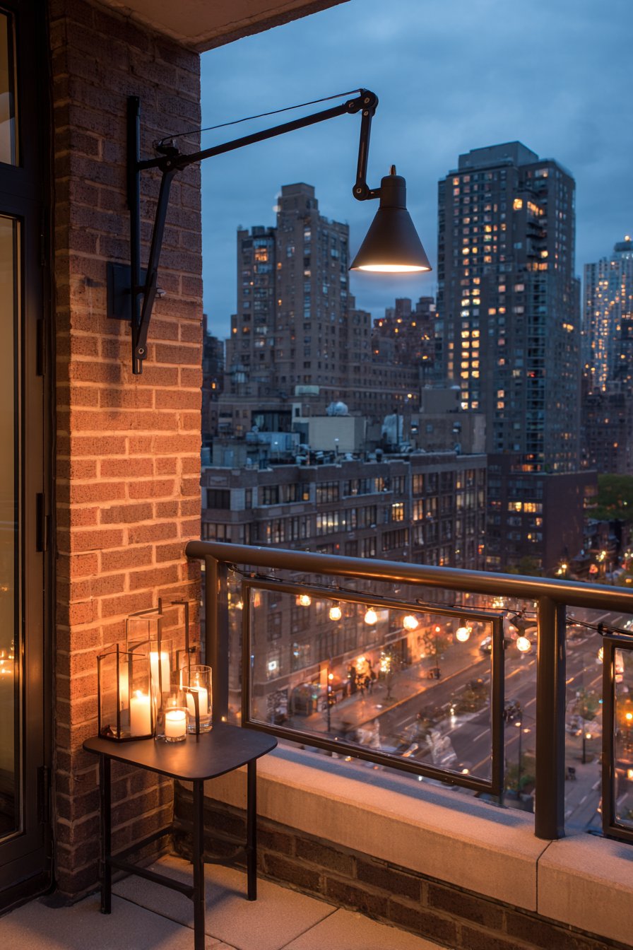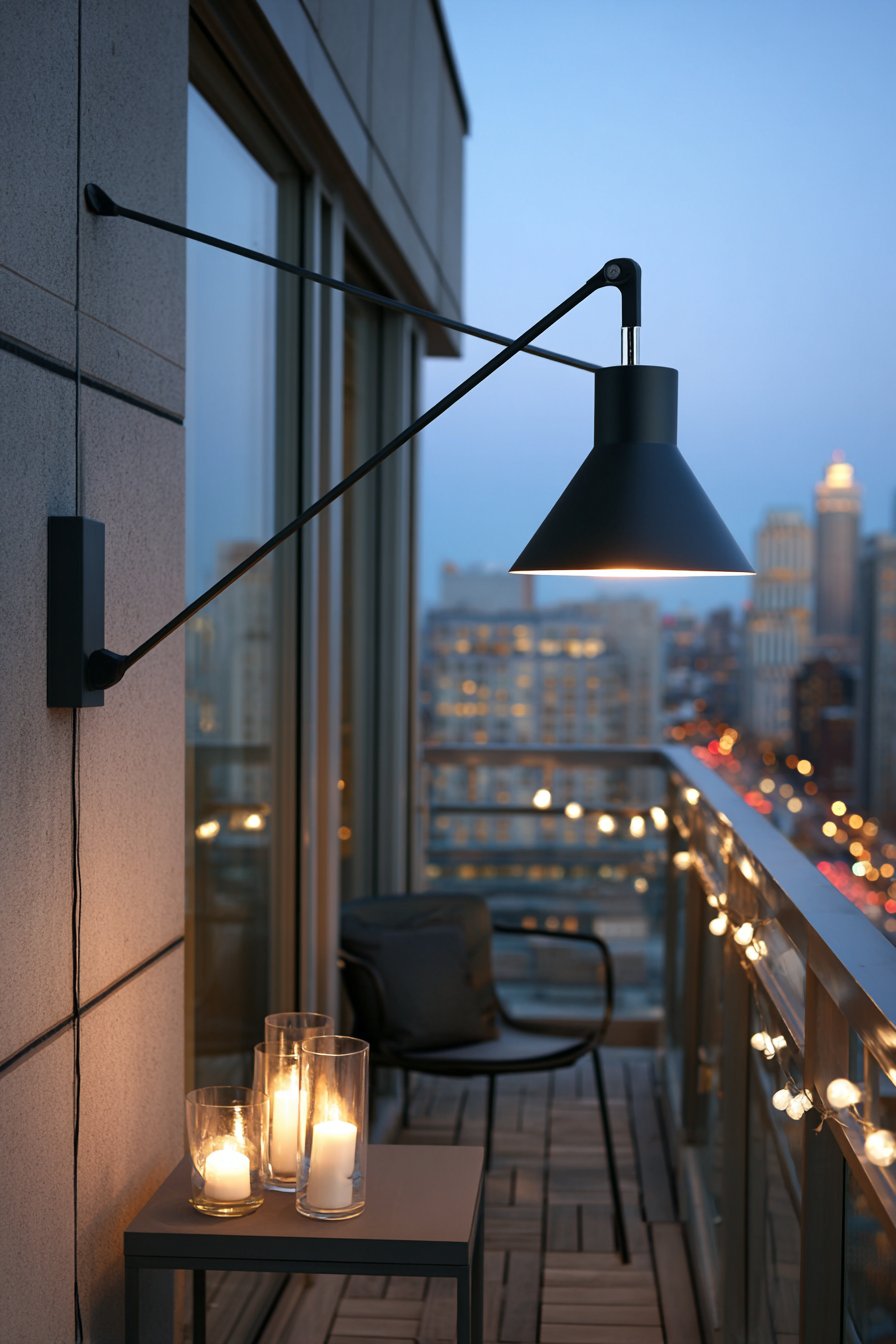 A minimalist urban balcony demonstrates compact outdoor lighting for limited spaces. A sleek wall-mounted swing-arm lamp in matte black provides an adjustable reading light. Battery-powered LED candles in glass hurricanes create an ambient glow on a small side table. String lights with simple white globe bulbs outline the balcony railing perimeter.