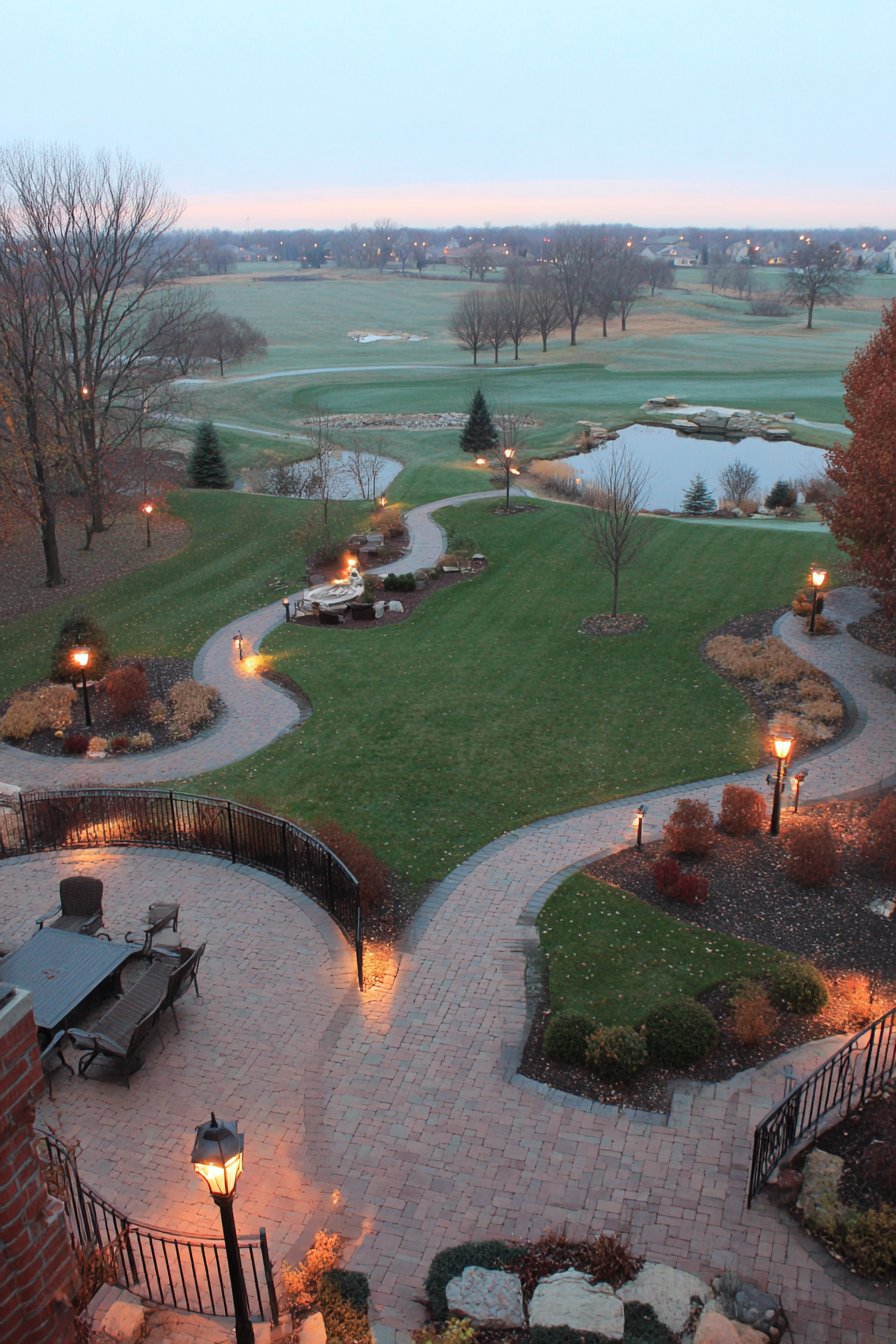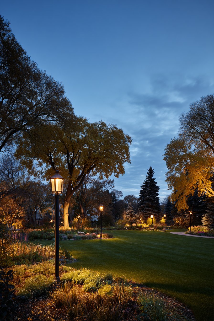 Low-voltage path lighting systems offer energy efficiency for extensive gardens. Garden bed illumination highlights plantings while guiding movement. Fire pit area lighting extends usability into evening hours. The comprehensive approach demonstrates professional-level landscape lighting design.