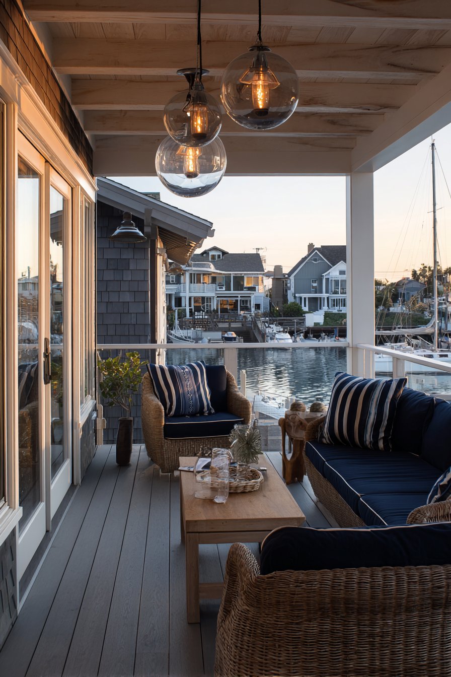 Chrome and glass fixtures catch reflections from nearby water features. Maritime-inspired lighting complements navy and white striped outdoor cushions. Professional photography captures how specialized fixtures enhance the beachy aesthetic. The nautical theme creates cohesive coastal atmosphere throughout the deck.