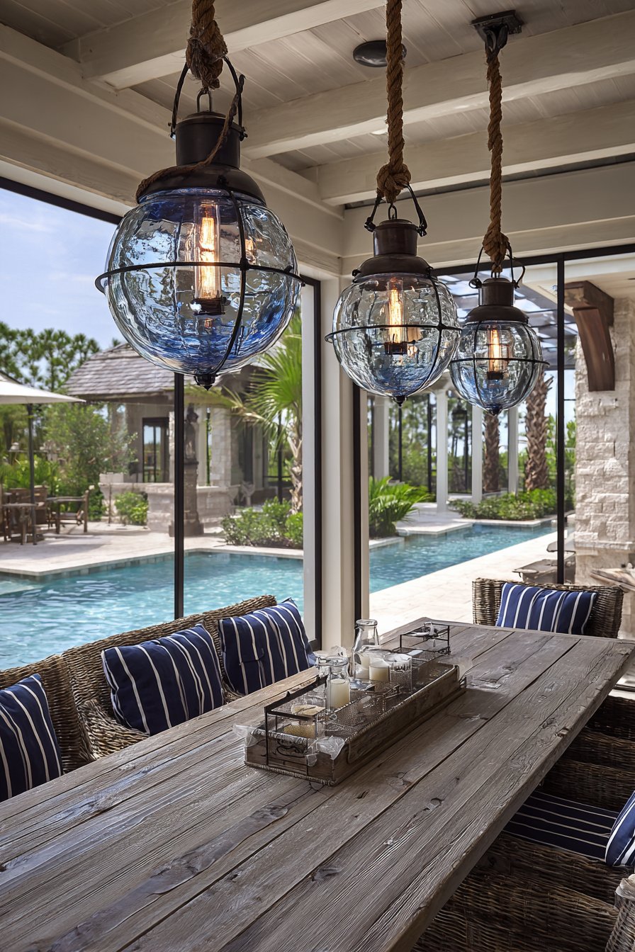 Converted ship lanterns bring authentic maritime character to the space. Electric conversion provides reliable illumination with vintage charm. Whitewashed wood posts coordinate with coastal color palettes. Rope-wrapped pendants reinforce the nautical theme through textural details.