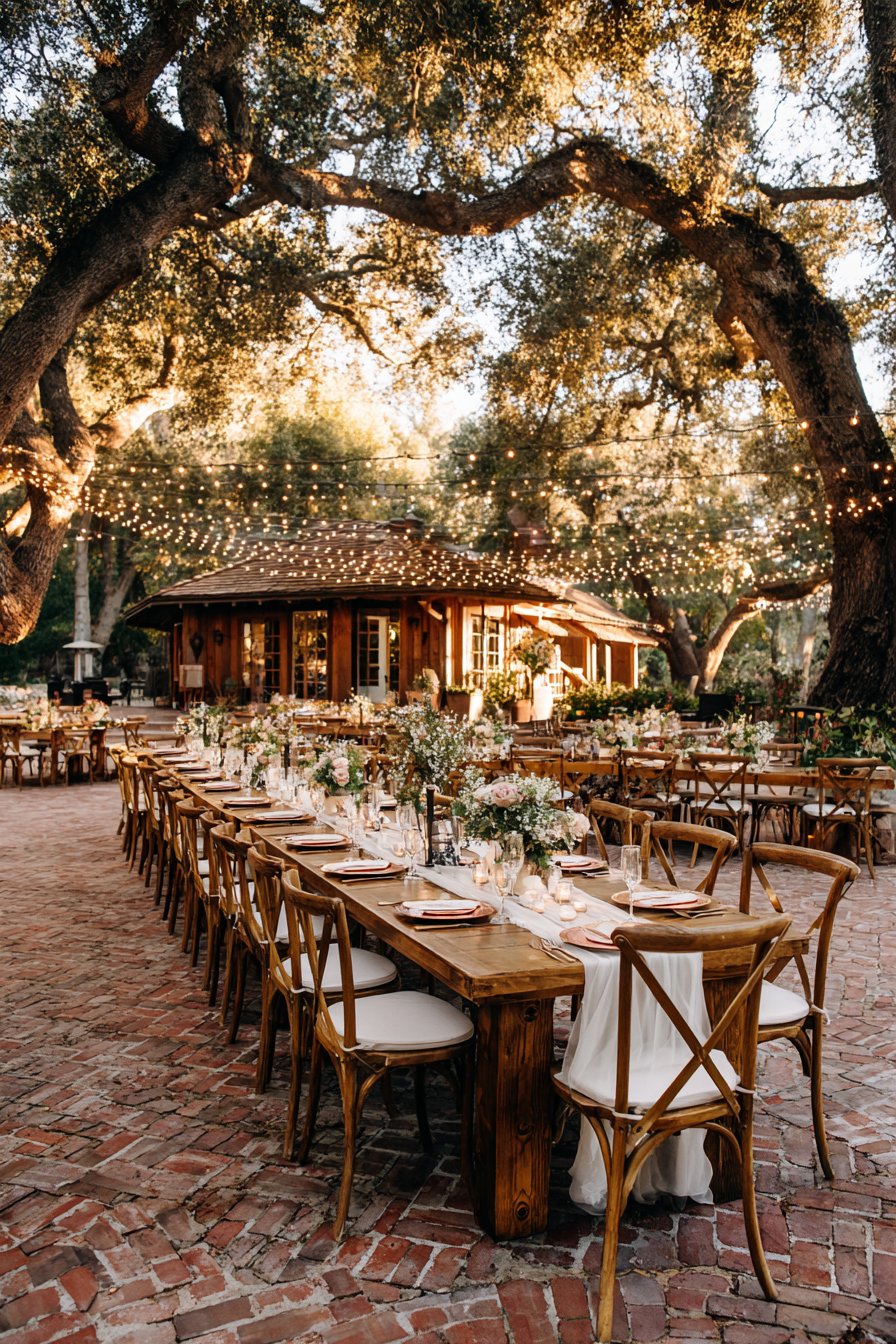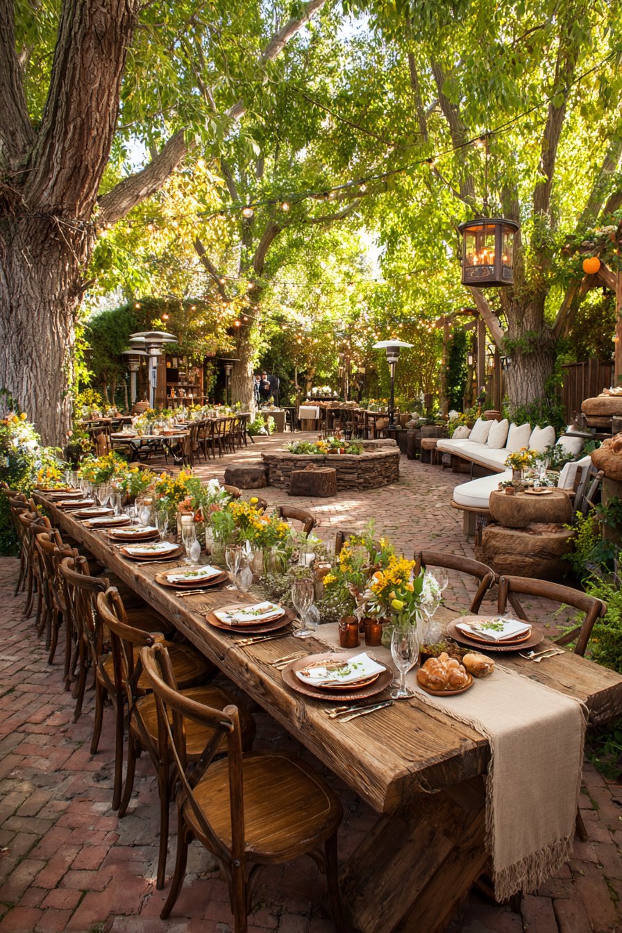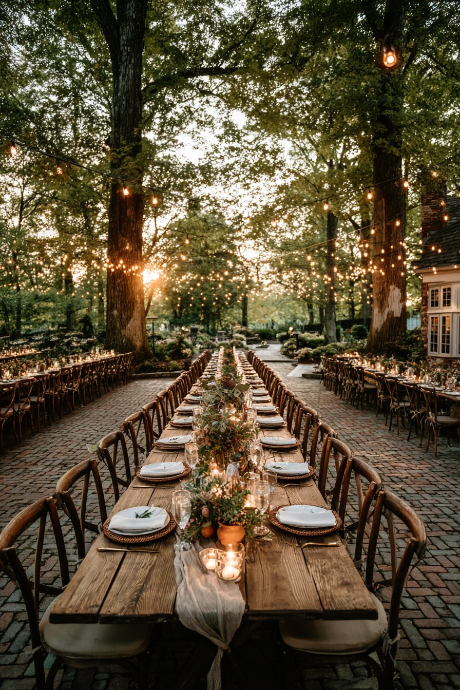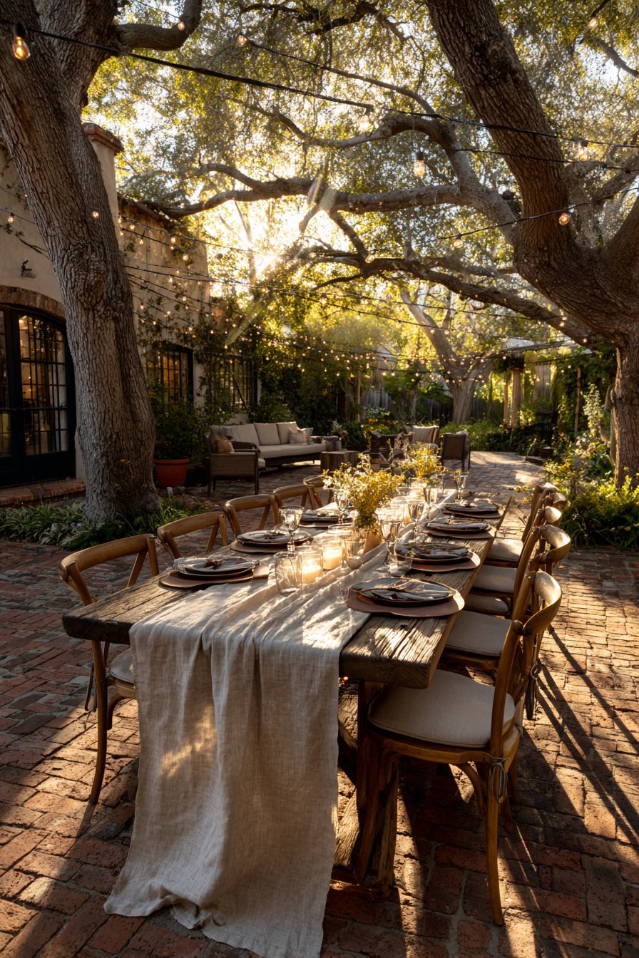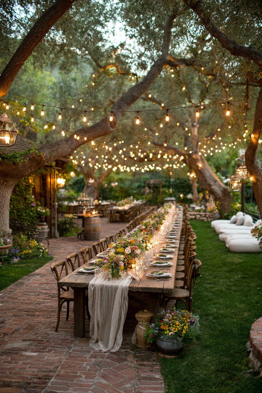 Picture a long farmhouse table dressed in flowing ivory linen beneath a canopy of string lights. The rustic wooden surface shows its natural character through visible grain patterns. Mature trees overhead provide natural architecture for crisscrossing illumination. The warm glow from Edison bulbs creates an enchanting ambiance as daylight fades.