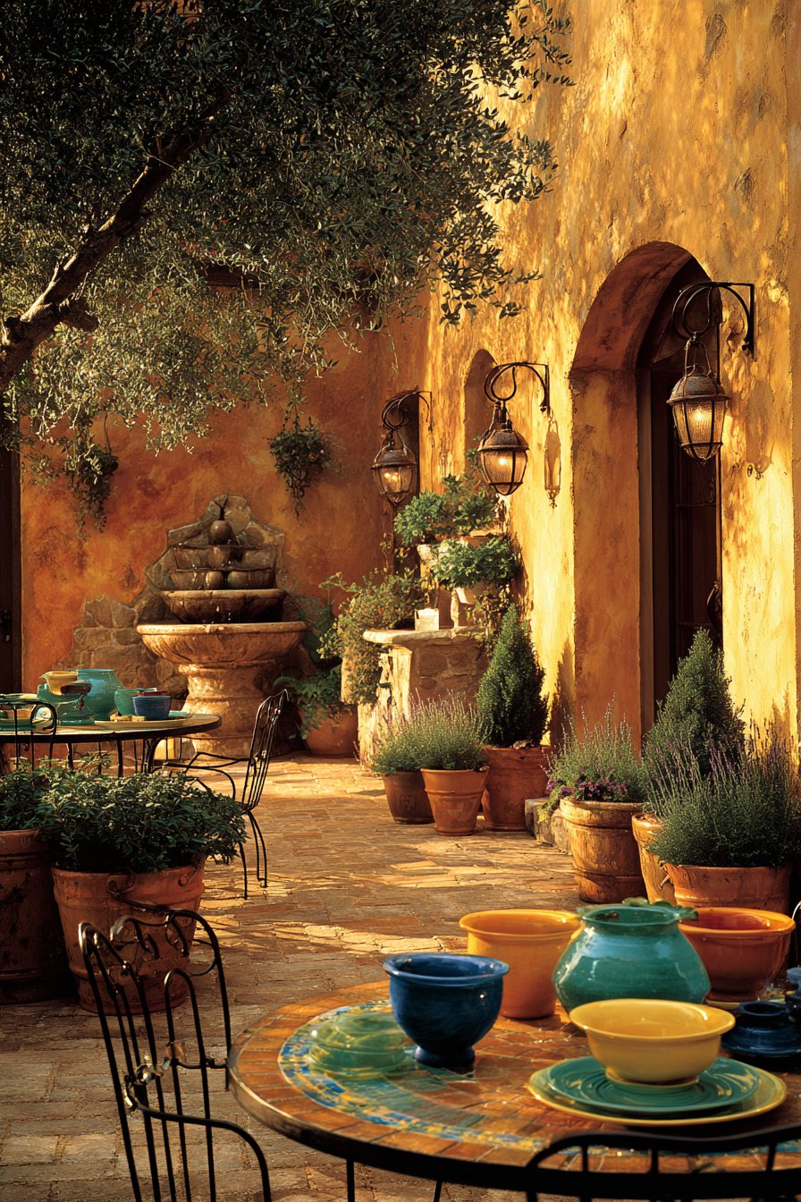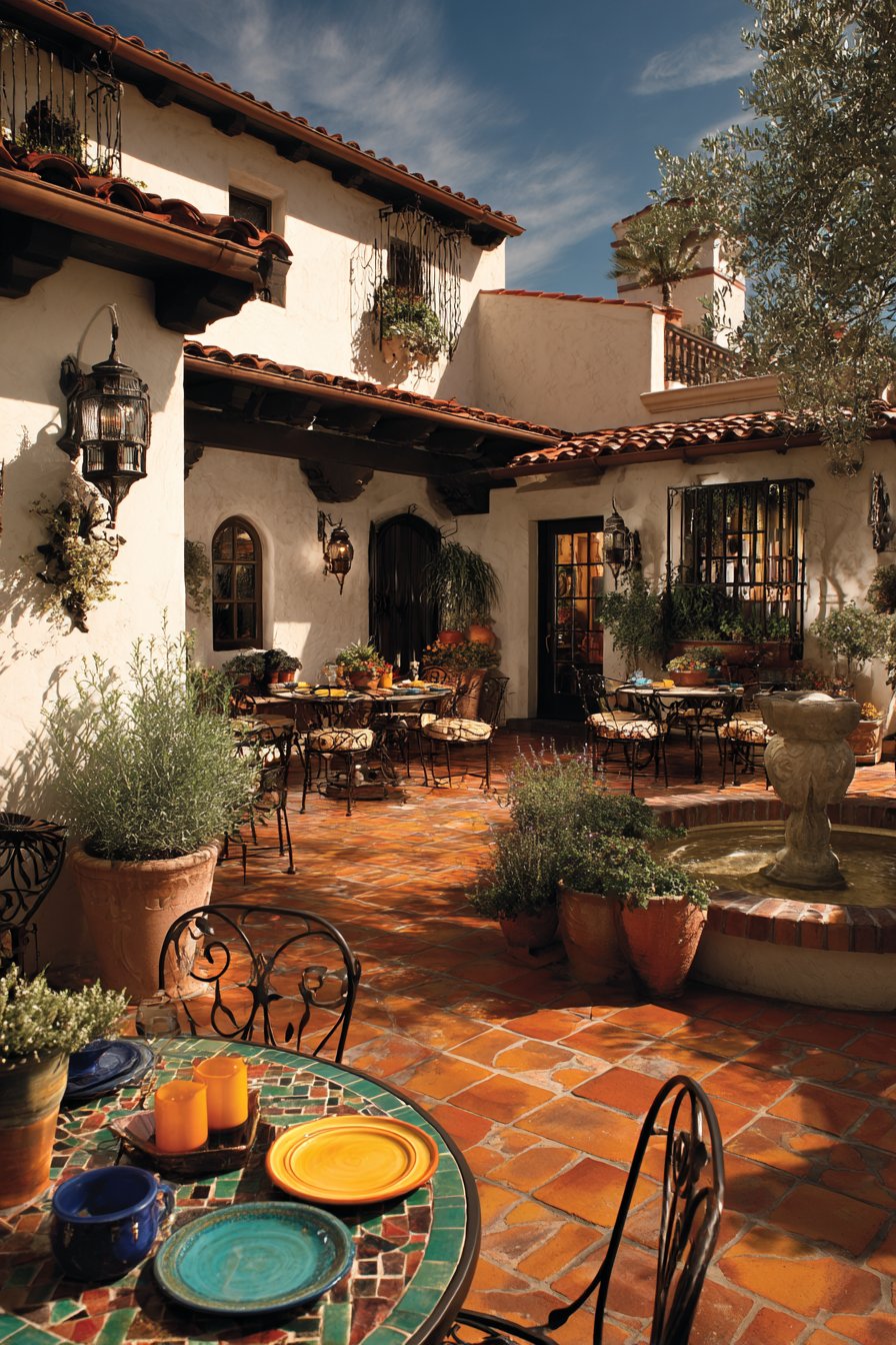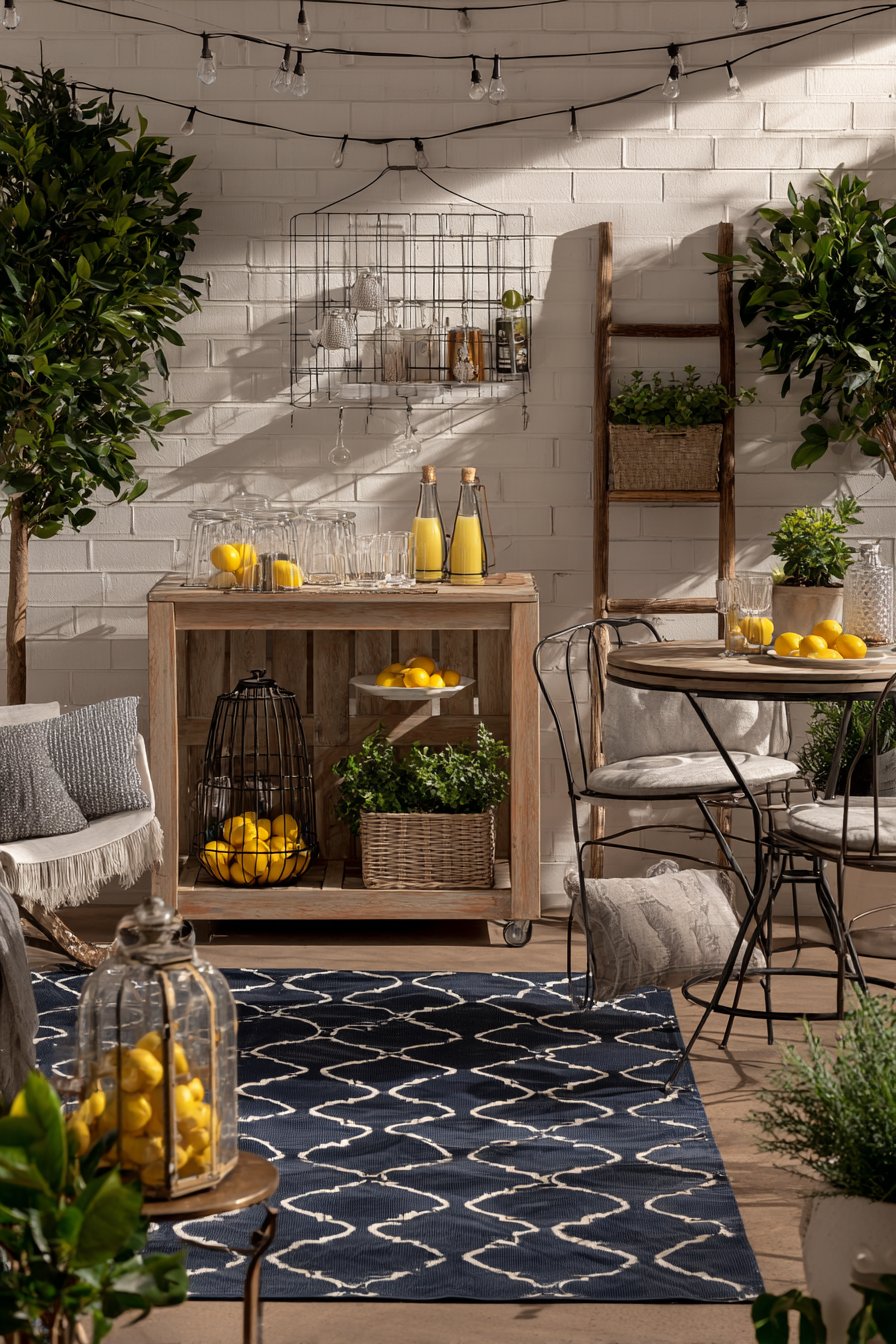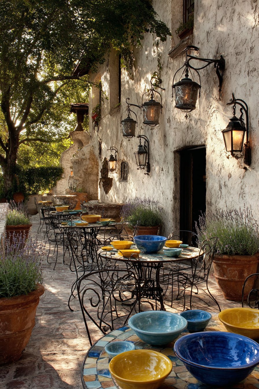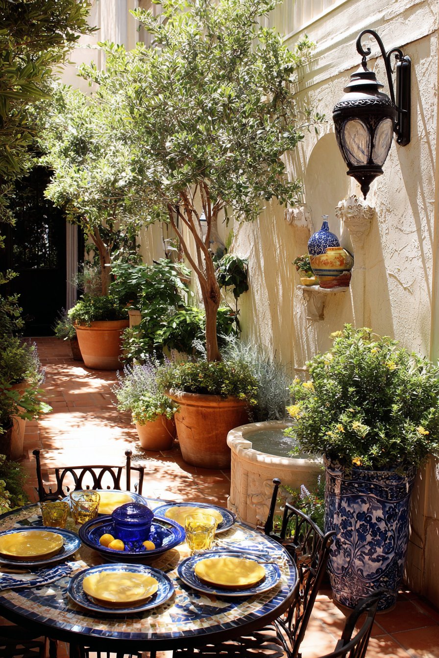 - Use brass lanterns and ceramic planters for warm metallic and organic accents