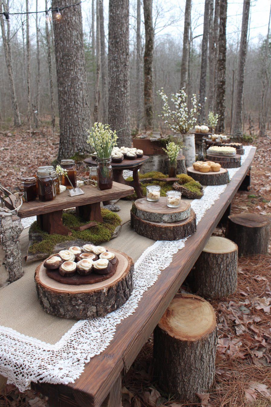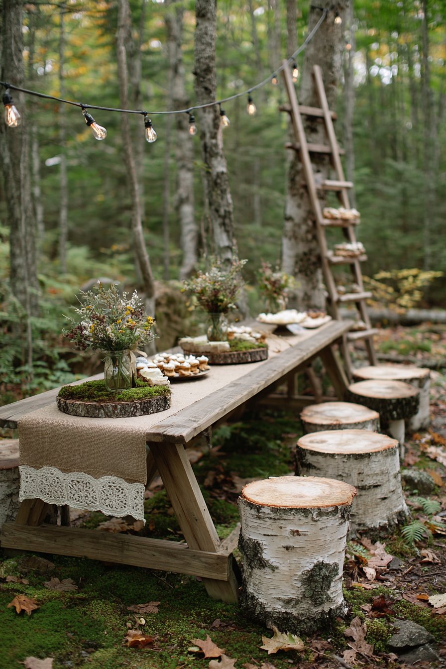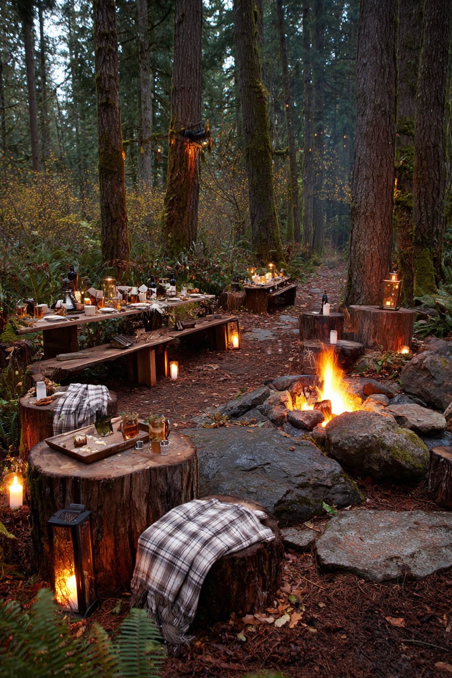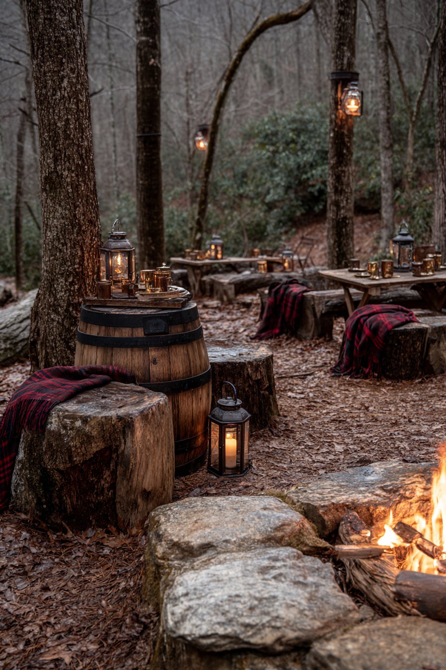 Stone fire pit surrounded by large flat rocks and log stumps creates woodland party seating. The natural stone arrangement blends seamlessly with forest environment. Plaid wool blankets draped over logs provide comfort and warmth. A wooden beverage trough made from halved wine barrel sits on stump table.