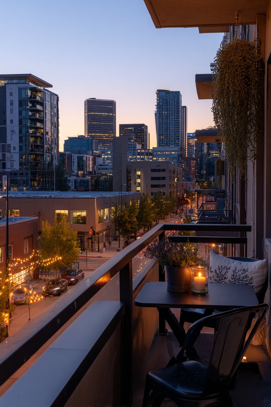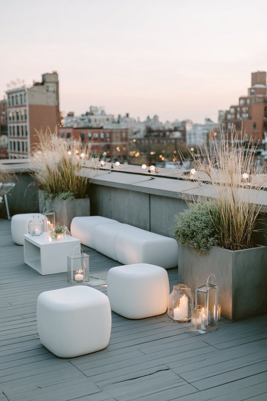 Simple glass hurricane lanterns with pillar candles offer subtle illumination. The restrained decorative approach allows the city skyline backdrop to command attention. A single strand of globe lights outlines the rooftop perimeter without overwhelming the space. Blue hour photography captures the balance between twilight and warm candle glow.