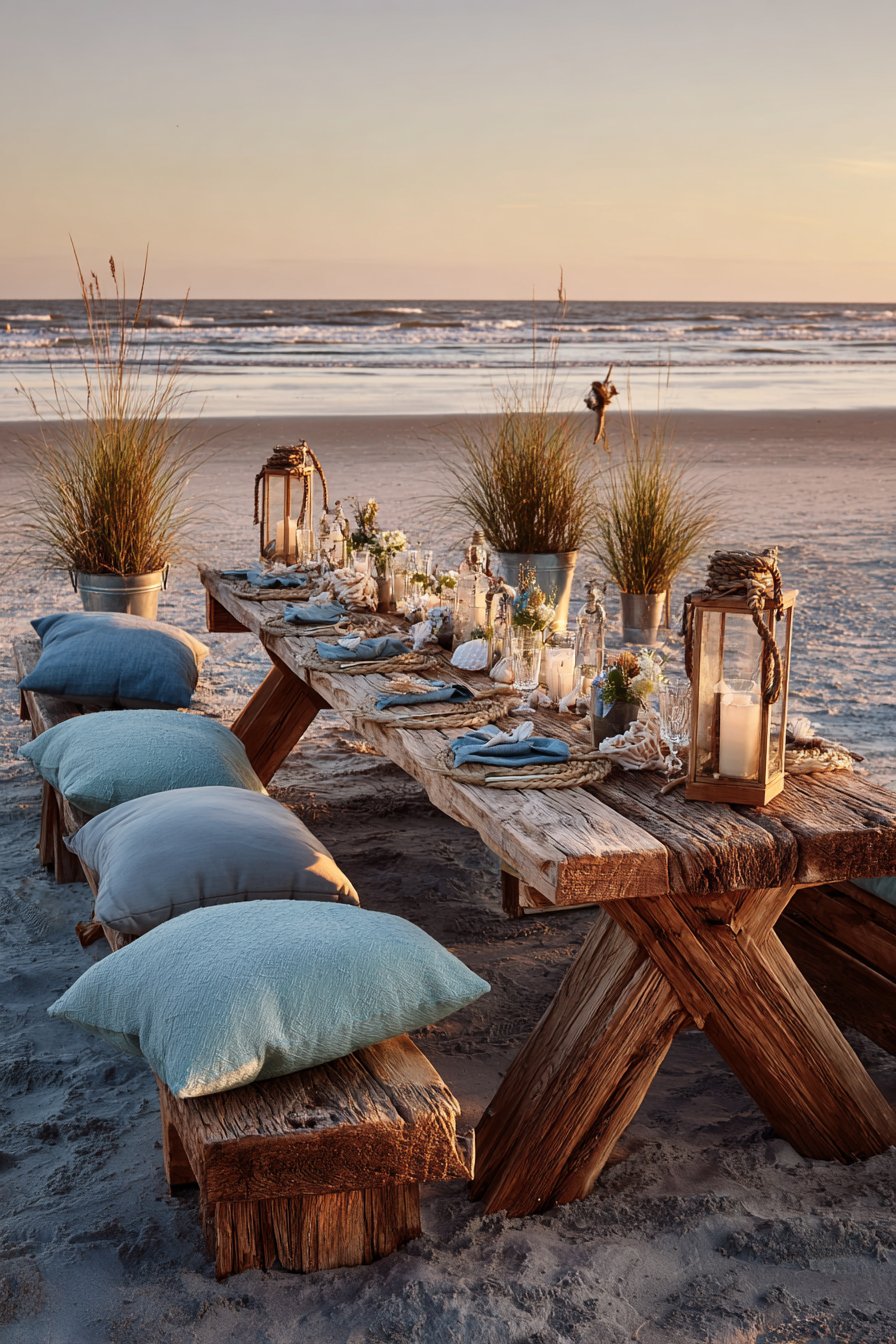 Nautical lanterns with rope handles and glass enclosures line the table length. Seashells, starfish, and coral pieces create organic centerpieces sourced from beach surroundings. Nearby tiki torches provide ambient light as daylight fades. Beach grass in galvanized buckets adds height and coastal texture.