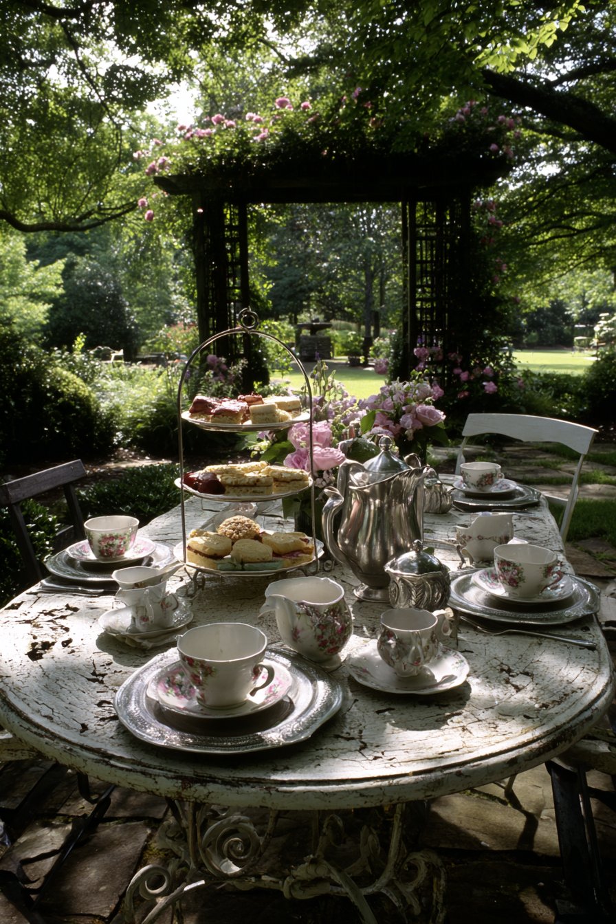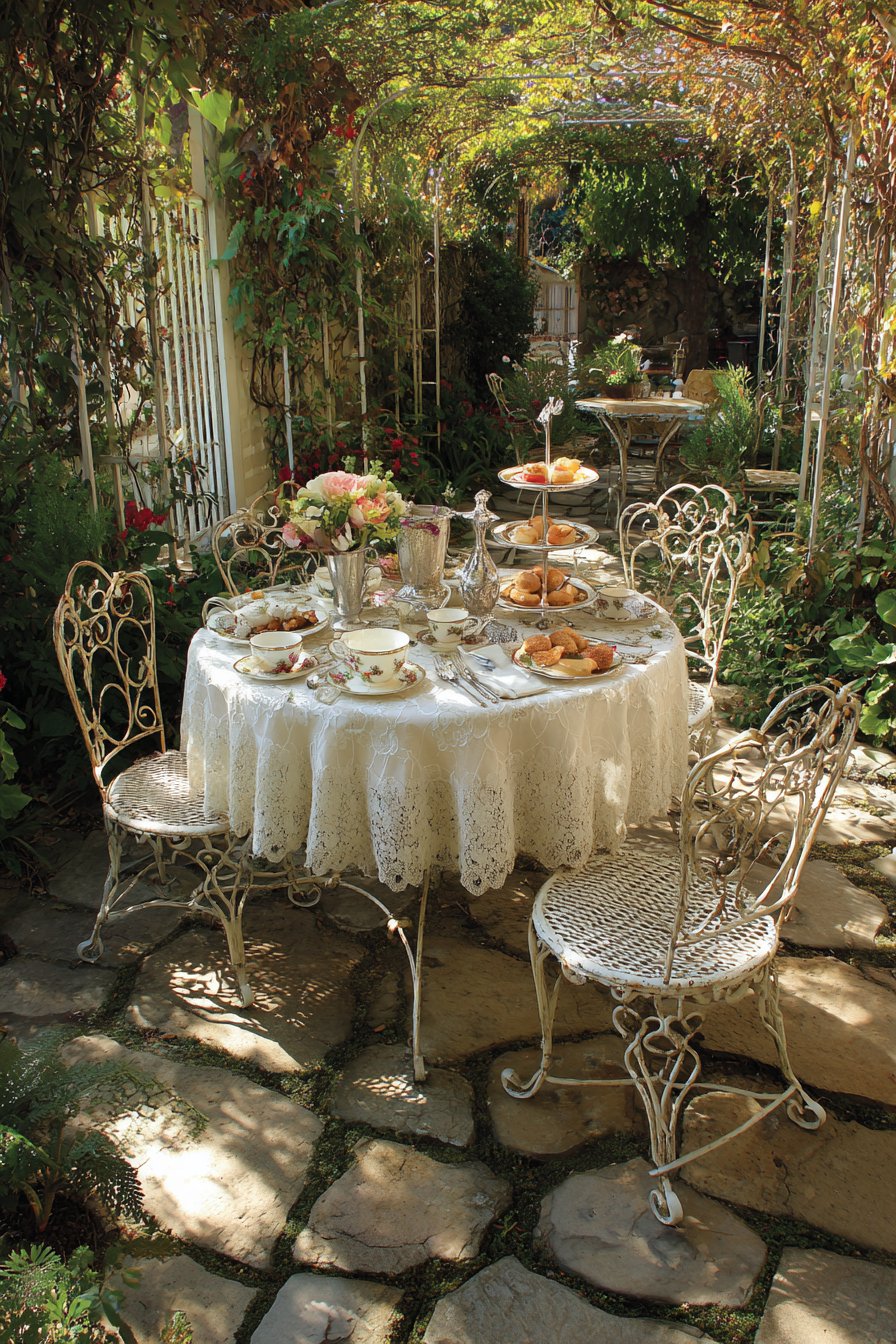 Climbing roses on nearby trellis provide a romantic floral backdrop. Soft morning light filters through established trees creating dappled shadows. Garden photography with shallow depth of field highlights charming imperfections and patina. The complete garden party tableau celebrates vintage elements in natural setting.