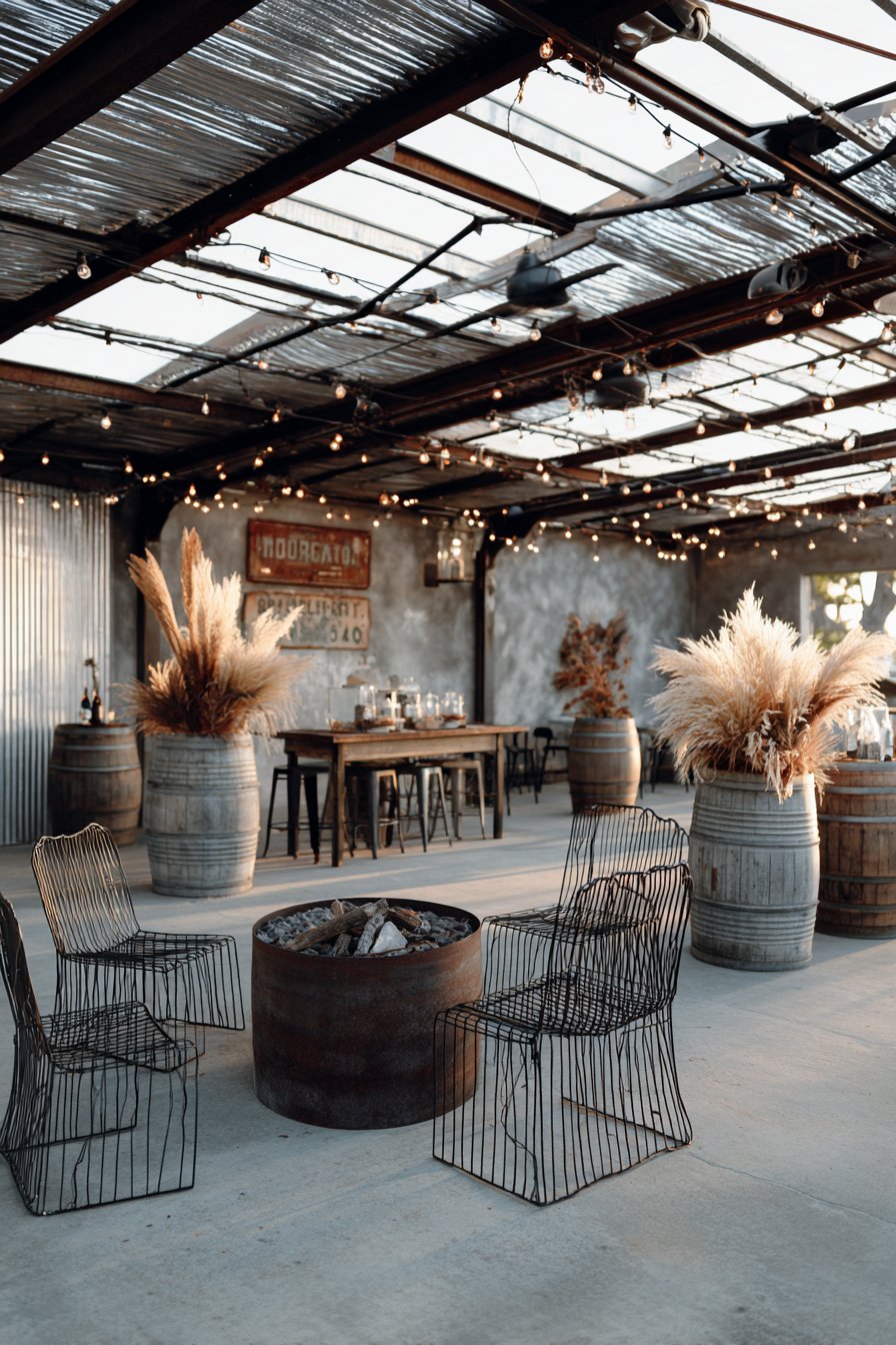 Metal wall art and repurposed industrial signage add decorative elements with urban edge. Early evening photography emphasizes raw textures of concrete, metal, and weathered wood. Dramatic side lighting highlights material authenticity and industrial design principles. Architectural photography captures urban outdoor party atmosphere.