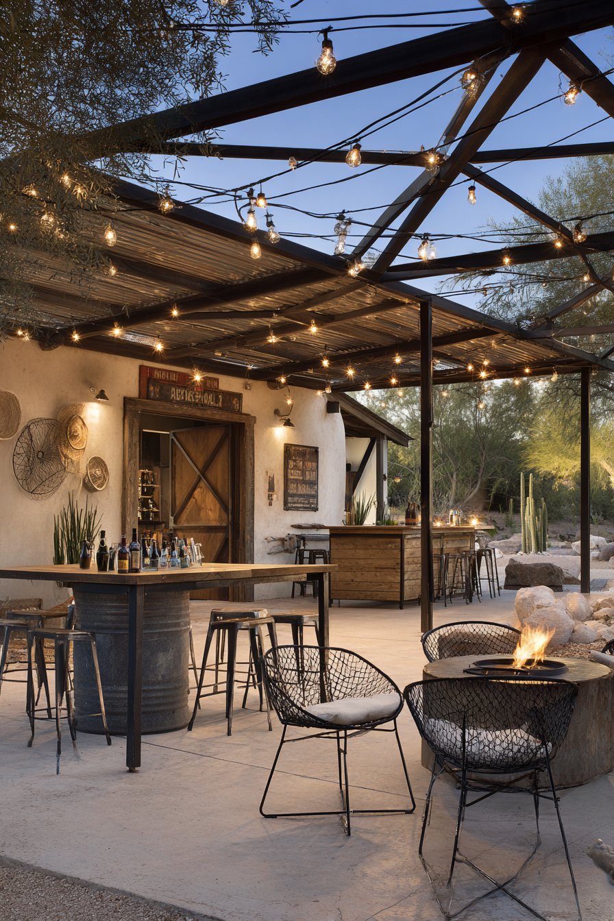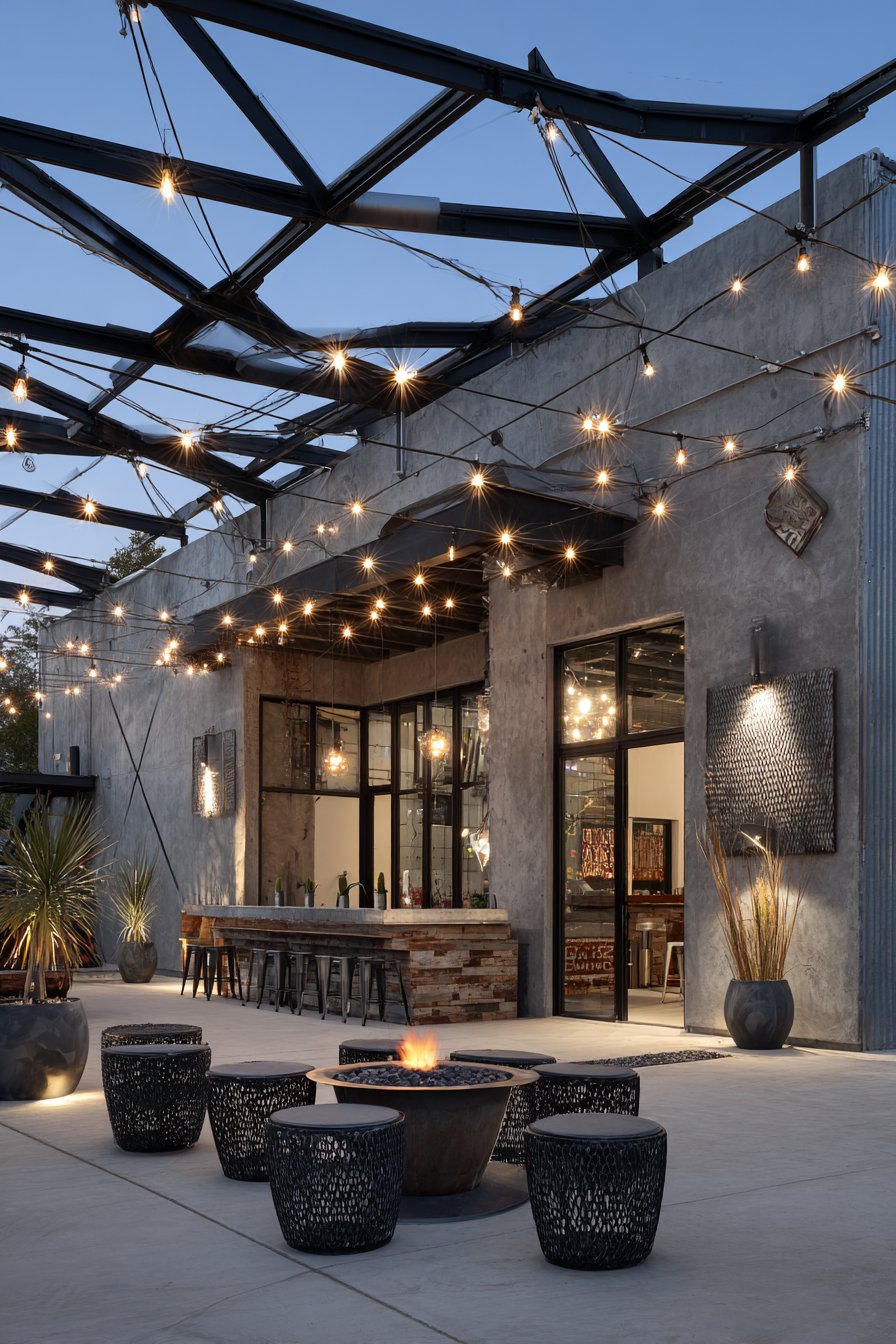 Concrete slab patio with metal furniture creates modern industrial outdoor party space. Steel drum accent tables and wire mesh chairs feature minimal cushioning. The raw industrial materials make bold design statement. Edison bulb string lights hang from black metal conduit pipes forming a geometric overhead structure.