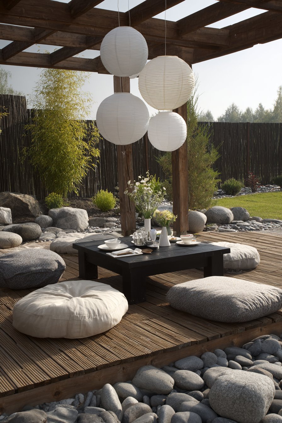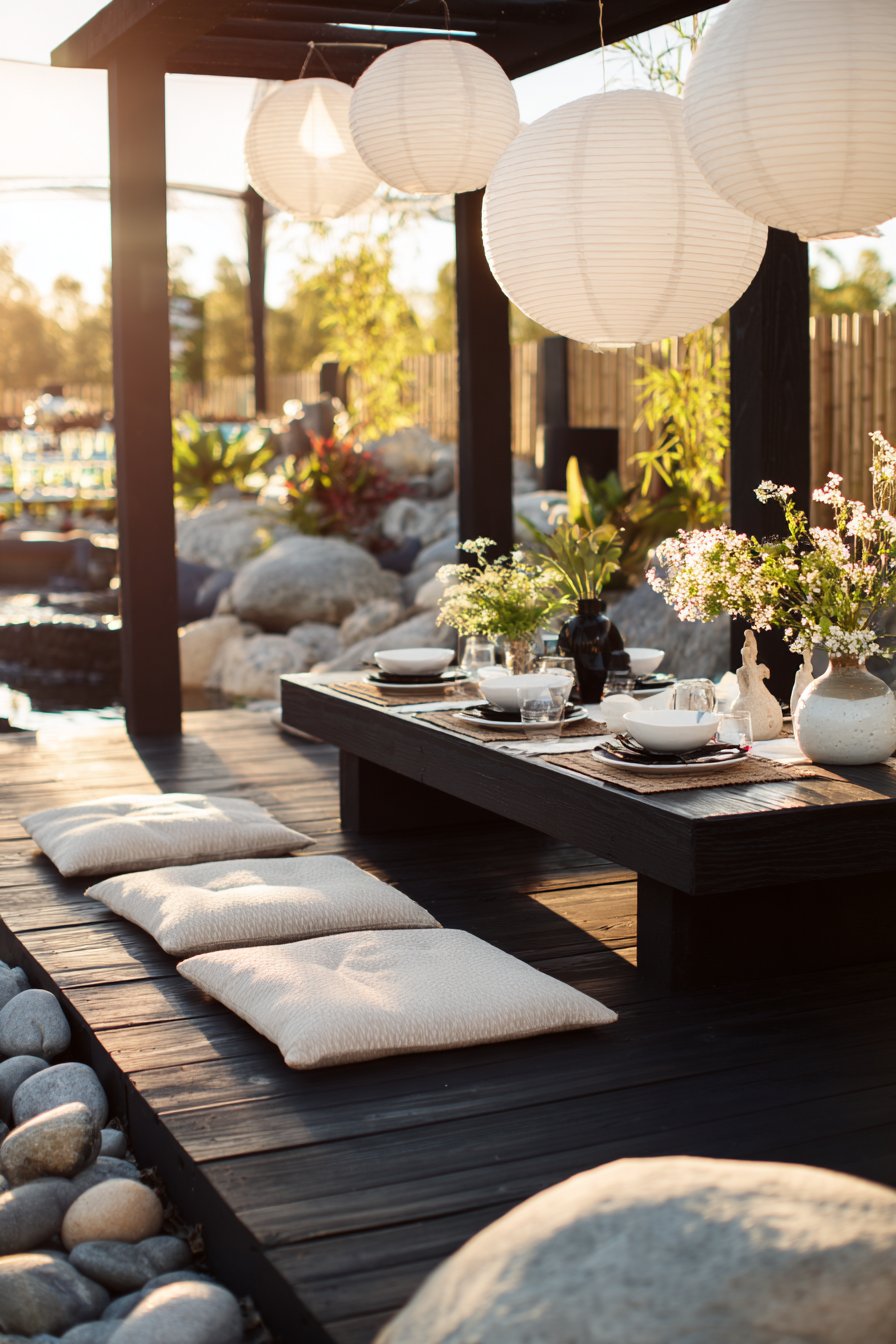 Low wooden platform deck with tatami-style outdoor mats creates Japanese inspired party area. Floor cushions in neutral linen fabrics surround low black lacquer table. Simple ikebana flower arrangements in ceramic vessels provide restrained decorative elements. Paper lanterns in white and natural wood frames hang from simple pergola structure.