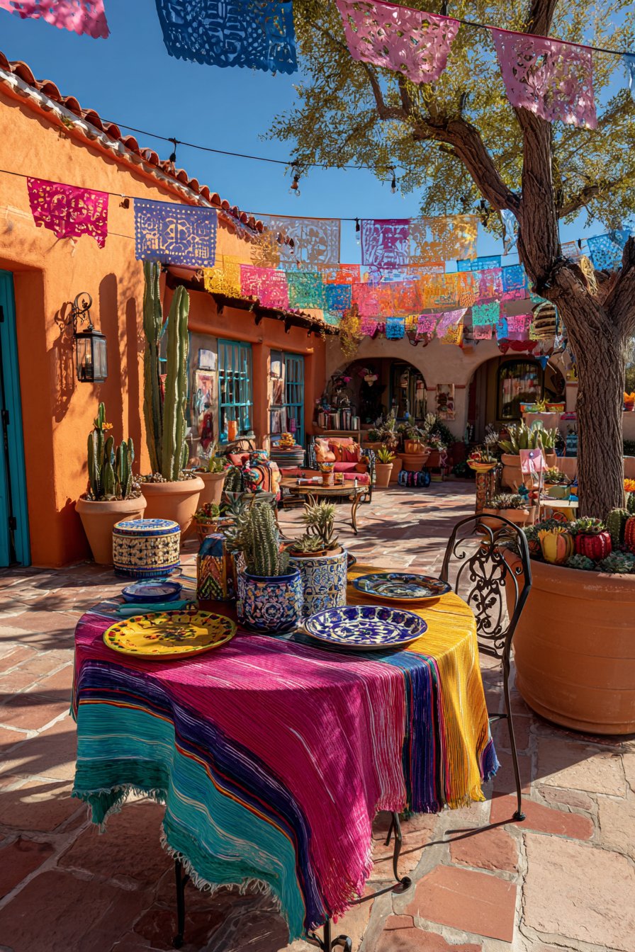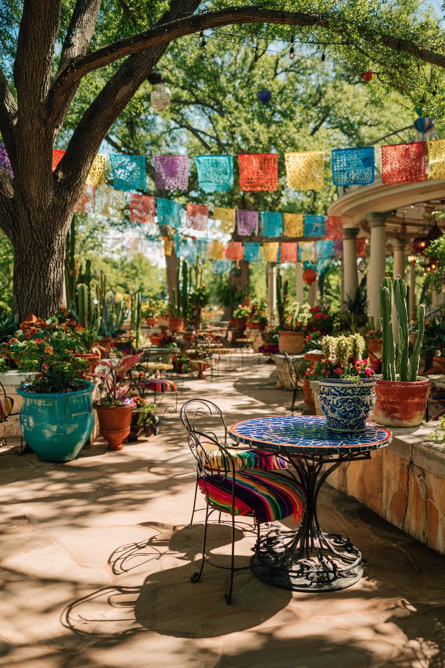 Papel picado banners in multiple colors strung overhead create festive fiesta atmosphere. The traditional cut paper decorations add authentic Mexican party decor. Mexican tile topped table with wrought iron base serves as central dining surface. Bright serape blankets function as colorful table runners with bold patterns.