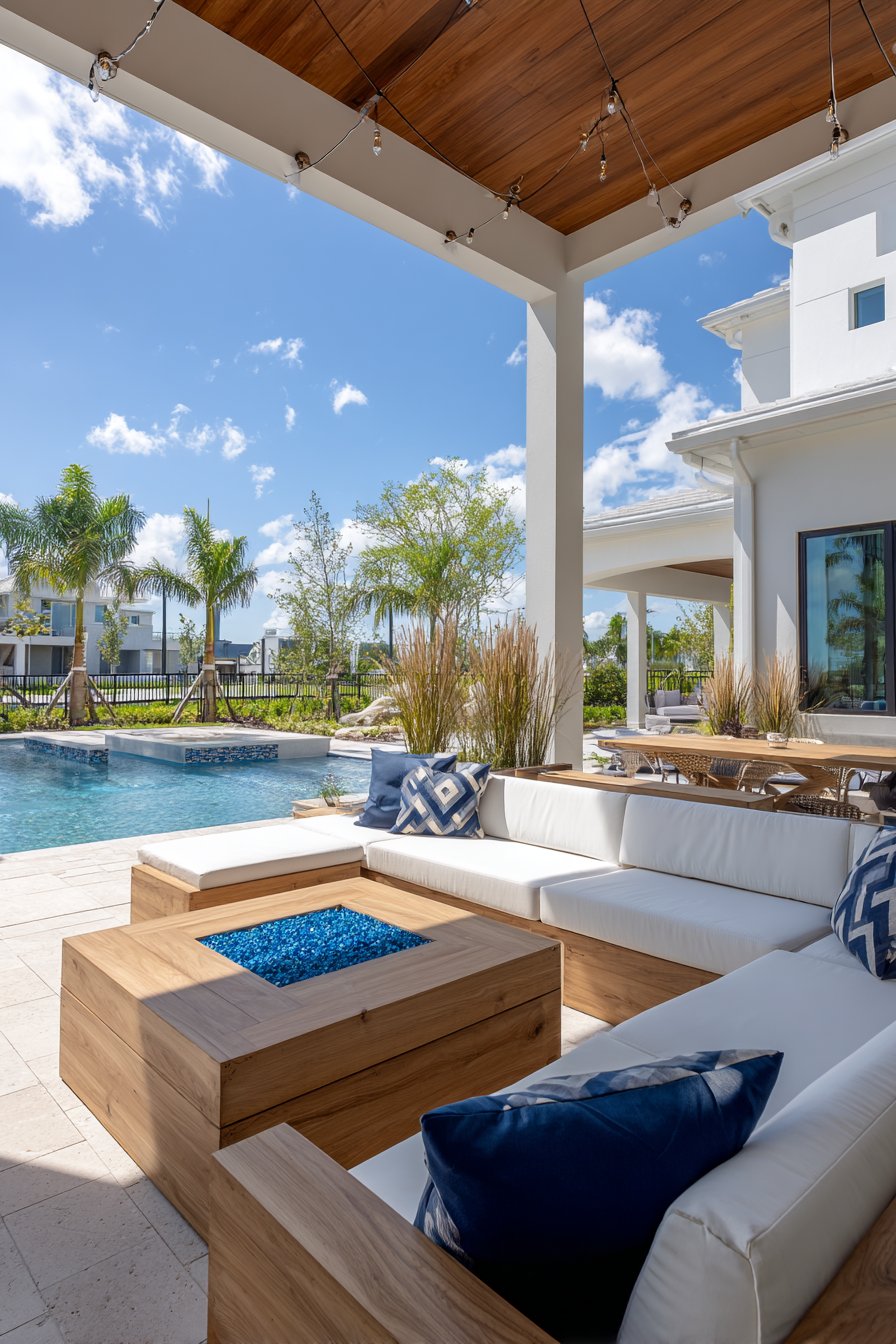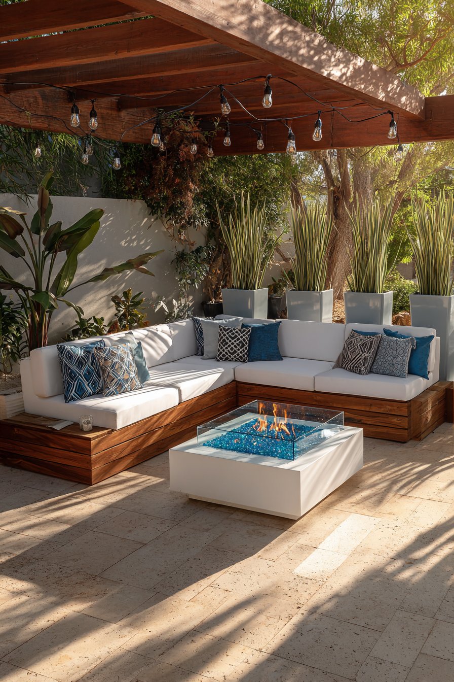 A fire pit table with blue glass fire media serves as the conversation centerpiece. The linear design complements the sectional’s geometric configuration. Flames dancing above colored glass create mesmerizing visual interest. Tall outdoor planters filled with ornamental grasses define the entertainment zone’s boundaries.