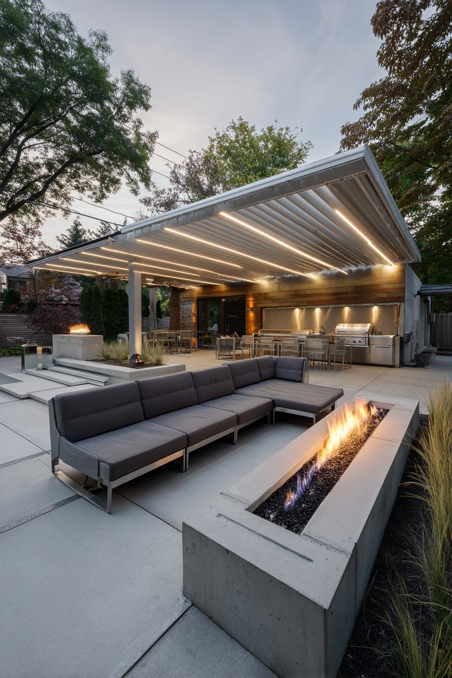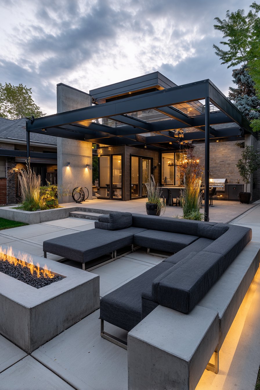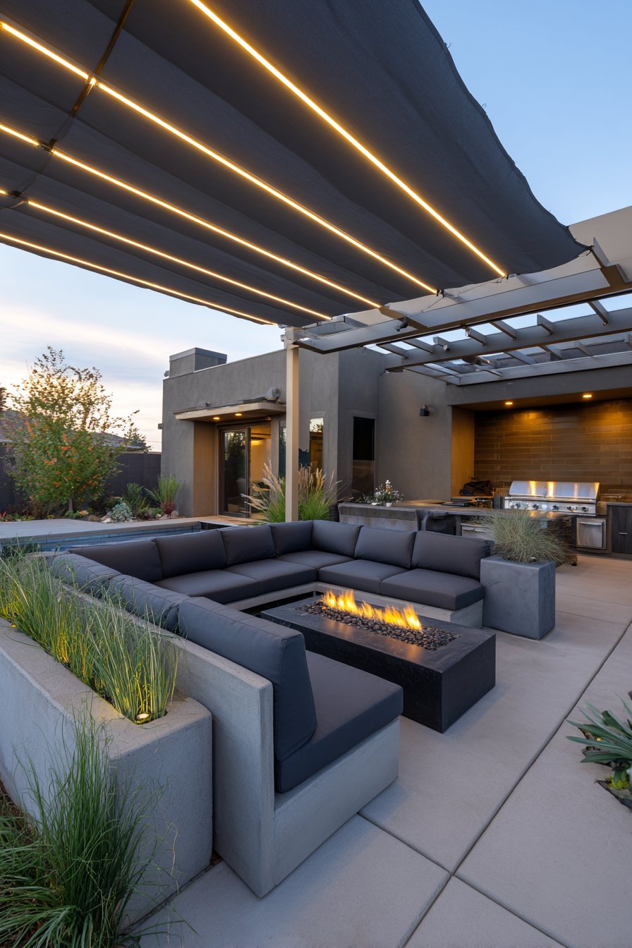 Architectural concrete planters with ornamental grasses and modern sculptures provide vertical interest. Recessed LED lighting in pergola beams offers adjustable ambient illumination. A weatherproof outdoor kitchen with stainless steel appliances sits adjacent. Early evening photography shows an activated fire feature and LED lighting.
