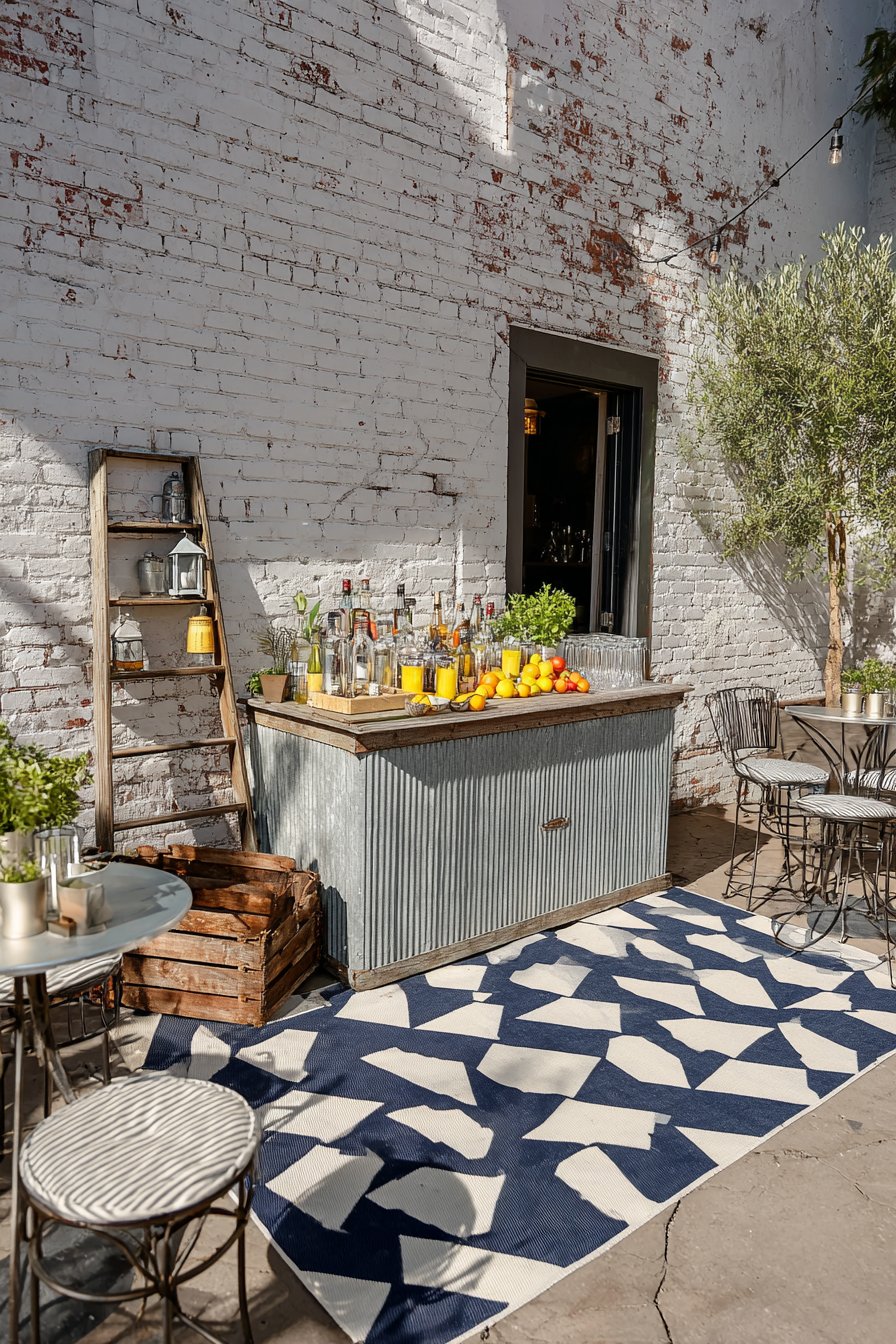 The concrete patio floor provides neutral foundation for layered design elements. A geometric outdoor rug in navy and white defines the beverage station area. Metal bistro chairs with cushions surround small round tables scattered throughout the space. The furniture arrangement encourages mingling while maintaining intimate conversation zones.
