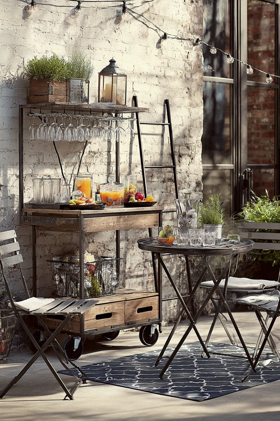 A festive patio setup showcases a bar cart station crafted from galvanized metal and reclaimed wood. The industrial materials create rustic charm against white-washed brick walls. Fresh citrus arranged in wire baskets adds vibrant color and practical function. Potted herbs provide garnish ingredients while contributing fresh greenery.