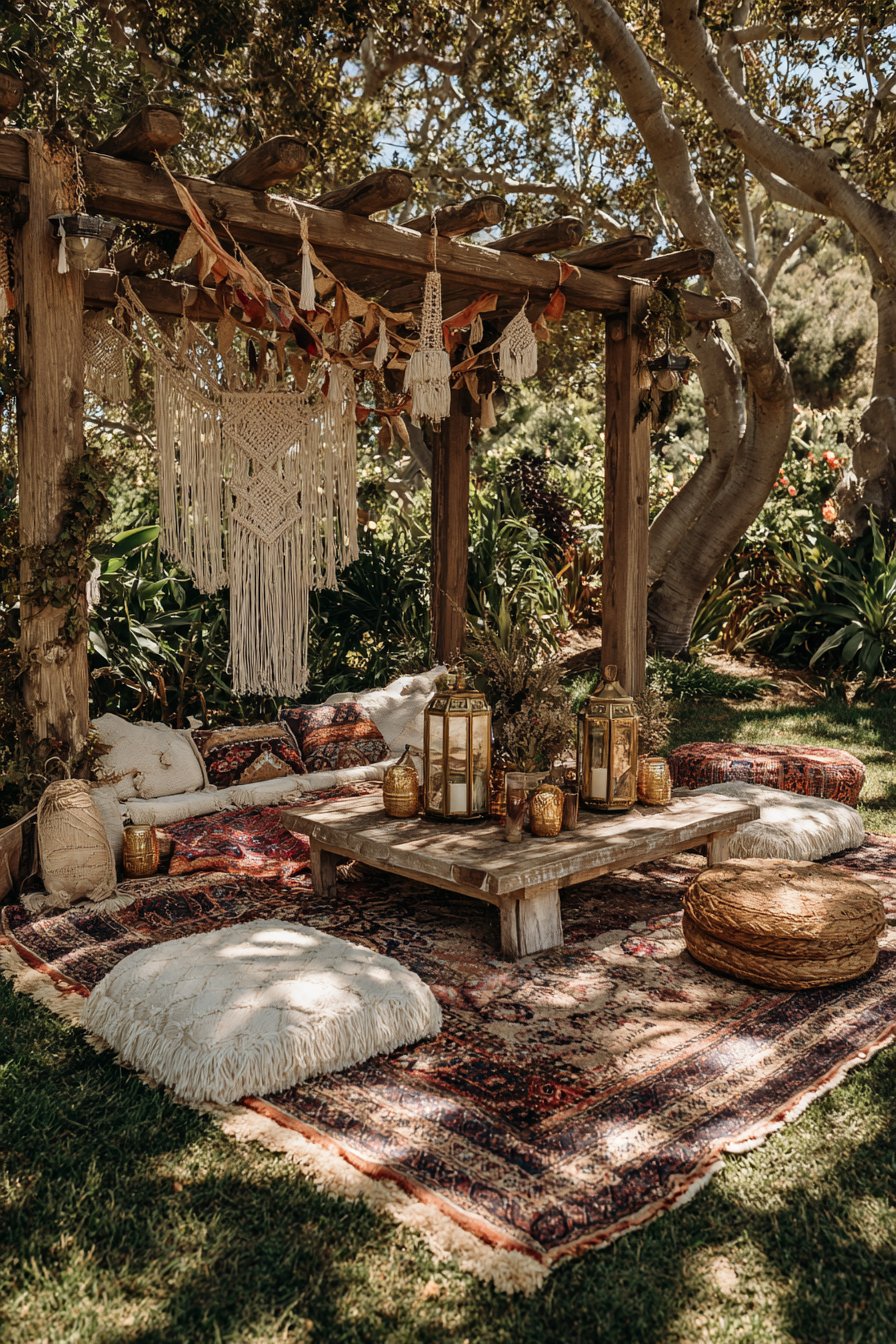 Macramé hangings suspended from tree branches and pergola structures create bohemian atmosphere. The intricate knotwork patterns add artisanal texture to the outdoor space. Low seating arrangements using floor cushions and poufs invite relaxed lounging. Vintage kilim rugs arranged on natural grass provide colorful foundation layers.