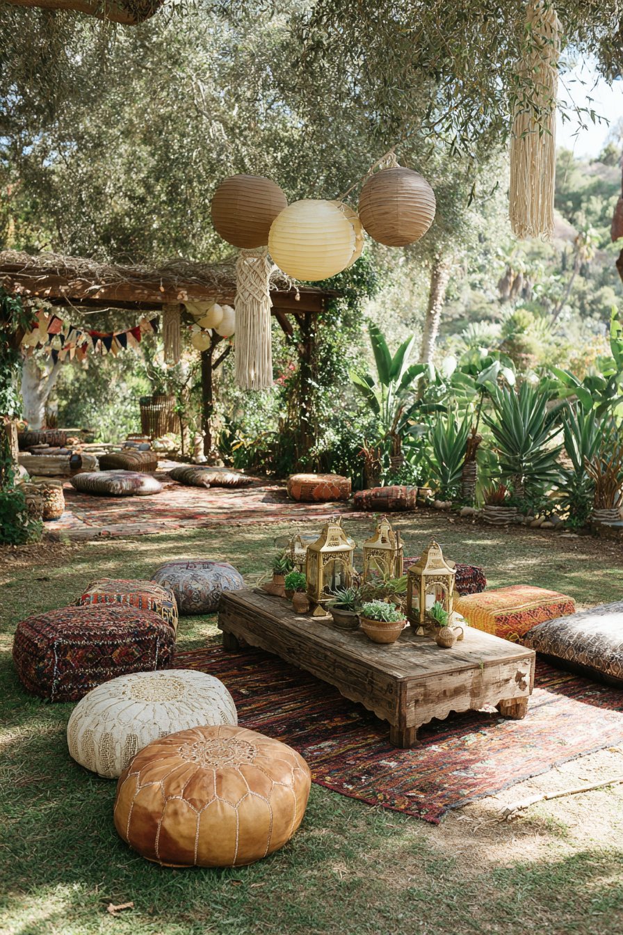 Late afternoon light filtering through tree canopy creates dappled shadows on textured textiles. This natural lighting effect enhances the layered bohemian aesthetic. The relaxed seating arrangement on grass feels casual yet carefully curated. Guests experience comfort through abundant cushioning and an informal gathering style.